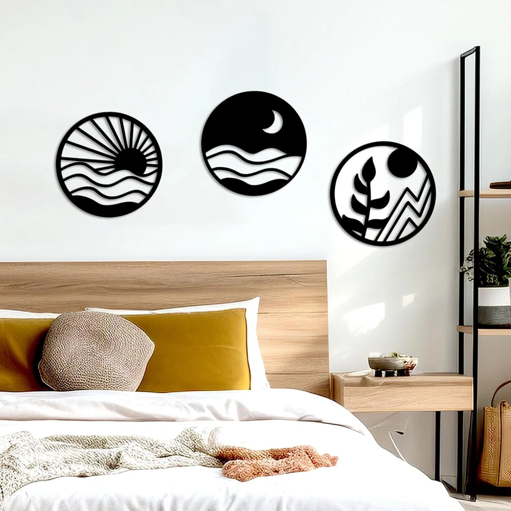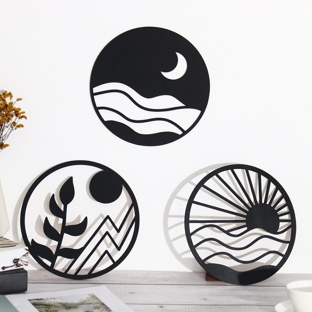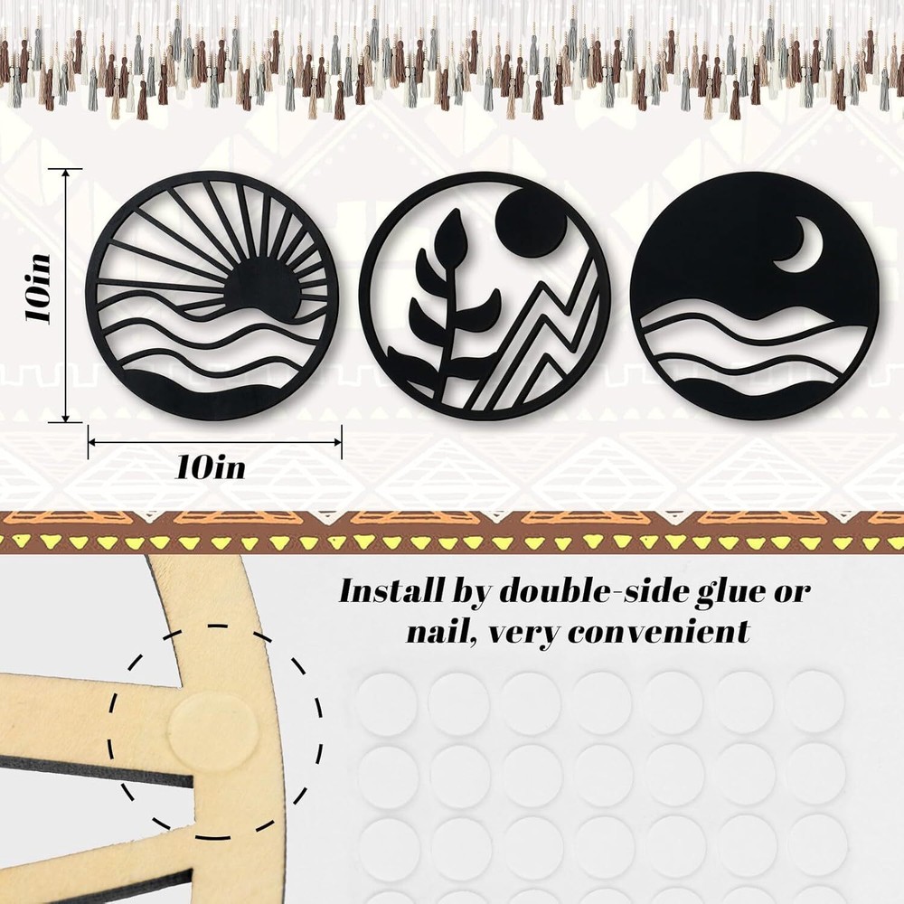 You will receive: The package includes 3 pieces of black round hollow wall artistic decoration, their pattern is design from popular Boho styles, such as sunrise, moonlit night, plant leaves, unique and vivid. The rich styles and sufficient quantity can meet your diverse decorative needs. Suitable size: Each black round hollow-out wooden wall decoration measures about 10 x 10 inches, appropriate and exquisite, which makes them suitable for most home decoration occasions. In addition, they are lightweight and portable, easy to carry or change. Easy to use: These attractive wooden wall artworks can be posted on the wall with the round double-side dot stickers or the nails, you can show this beautiful decoration where you want, adding great nature taste and artistic atmosphere to your home environment. High-quality material and gorgeous surface craft: These elegant wood wall decorations are made of quality wood, which is firm and durable, not easy to break or deform. Besides, the carved pattern is precise and the black painting is gorgeous, classic and not easy to fade. Perfect gift: The set of 3 pcs modern wall decorative ornaments are sweet Housewarming gift, Christmas gift, New Year gift for your families, friends, new neighbors and etc. And they can be displayed in the living room, bedroom, dinner room and other places, bringing home environment a touch of joy and nature.
