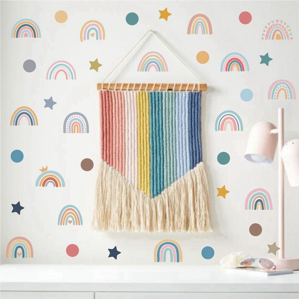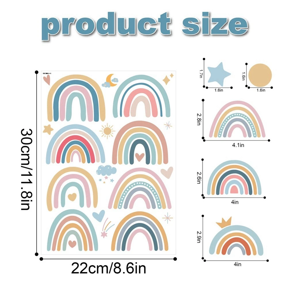 Boho Wall Decals Baby Nursery Bedroom Wall Decor X1F14439 It can be stuck onto any clean, dry, non-textured smooth surfaces: walls, , tiles, furniture, mirrors, even your refrigerators. wall stickers are made of high quality, bright and colourful, easy to peel and stick, removable and waterproof. rainbow wall stickers are perfect to decorate kids room, bedroom, living room, baby nursery and playroom. Including 8 sheets, sheet size: 22cm x 30cm, A total of 152pcs of wall stickers, and depending on your preference to DIY. Material: vinyl colour: multicoloured Package Contents: 8 x sheets wall decals(A total of 152pcs of wall stickers)