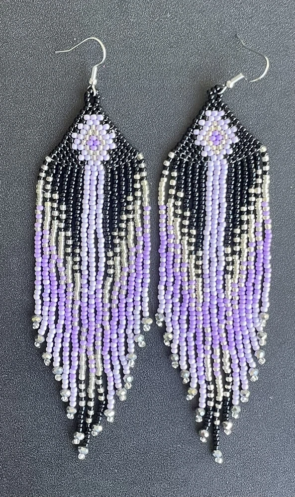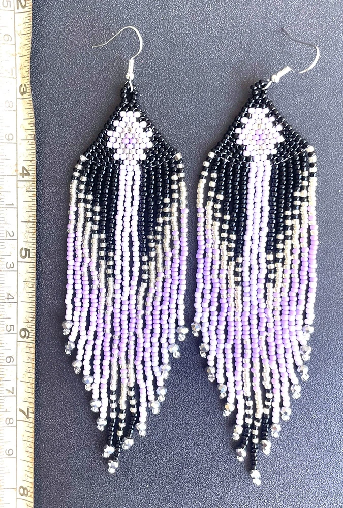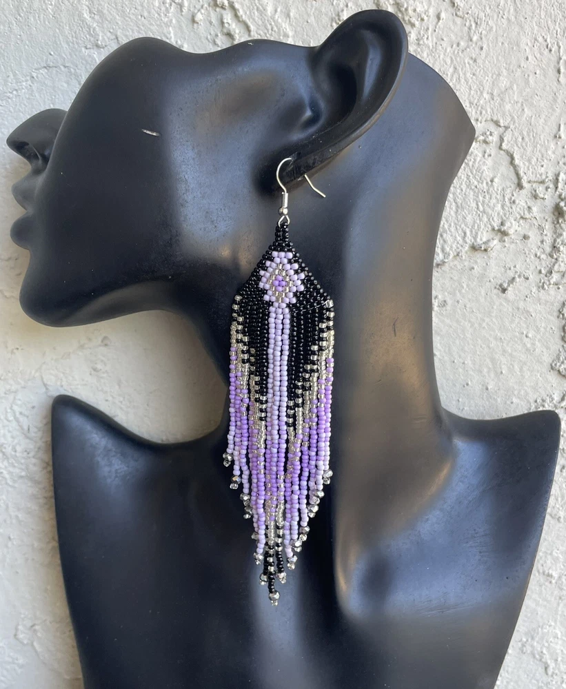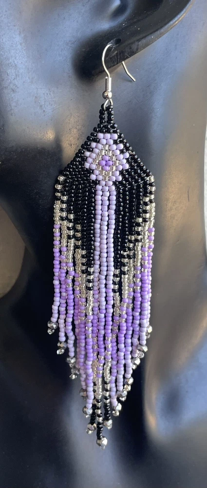 1 pair of long western style graduated black, purple and silver seed bead beaded earrings. You will receive earrings pictured. The earrings are made with seed beads. The earrings are approximately 5 1/2" long with the ear hooks included. They are for pierced ears. 0-ea-seed-250-1