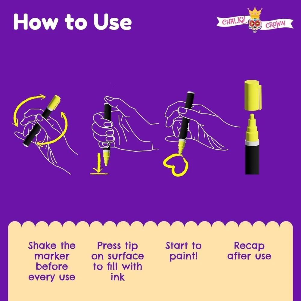 Store New Arrivals Add to Favorite View Feedback Contact Fast deliveries to the customer's home Quality customer service John Make the customers happy! Bold Liquid Chalk Markers - Dry Erase Marker Pens for Chalkboards, Signs, Windows, Blackboard, Glass, Mirrors - Chalkboard Markers with Reversible Tip (8 Pack) - (Multicolored, 6Mm) Description Fun and Easy to Use- Time to replace the old dusty chalk with bold neon color chalk markers Safe and Odor Free- Dustless, non-toxic formula is both eco-friendly and safe for use at home Comes Off Easy- When you’re ready to write & start fresh, a mere wipe of a wet paper towel will remove your erasable chalk markers completely and easily from almost any non-porous surface Made for Everyone- Whether you're a Teacher, Mom, Student, Artis, Bistro Owner, these are the chalk markers you're looking for The Crafty Promise- If for any reason, you're not completely satisfied, simply contact us and we'll take care of it Product Description Water Based These Bold Chalk Markers are water-based and have a reversible tip. So they are washable, reusable and safe to use while keeping their incredible vibrant colors. Non Toxic The Bold Chalk Markers are formulated with non toxic materials and are safe for kids to draw and paint with! Now you won’t have to worry about the safety of the kids while they are playing with these amazing markers. Easy Wipe Out Now you won’t have to worry about tedious cleaning with the Bold Chalk Markers and their easy wipe-out formula. Don’t be afraid to express your ideas with these colorful markers. You might be interested in more products from the Chalky Crown family! White Chalk Markers Metallic Chalk Markers Vintage Chalk Markers Acrylic Paint Markers Item Weight 0.4 Grams Style 6mm - 8 Pack Number of Items 1 Target Audience Kid Color Red, Pink, Orange, Yellow, Green, Blue, Purple, White Pattern Solid Material Type Plastic Ink Color Red,Pink,Orange,Yellow,Green,Blue,Purple,White Marker Type Chalk Marker Body Shape Round Line Size 6 months Recommended Uses For Product Glass Surface Recommendation Glass Drill Point Bold Additional Features Reversible Tip, Erasable, Non Toxic Point Type Bold Hand Orientation Right Style Name 6mm - 8 Pack Number of Pieces 8 ABOUT US We offer the best prices around on high quality products. Our E-store includes media such as books, movies, music and games while offering electronics, toys, sporting apparel, clothing, tools, general home, garden items and more. SHIPPING We are always working hard to ensure your package arrives as soon as possible. Please understand that some factors like weather, high postal traffic, and the performance of shipping companies are outside of our control. We offer free shipping to the lower 48 states and ship within 2 business days of payment, usually sooner. We do not accept P.O. Boxes. Please provide a physical address. For shipping outside of the continental USA, we only use eBay's Global Shipping Program. The item is shipped to KY and then sent to the rest of the world. International customers are responsible for all duties and taxes. Continue to 'check out' to calculate costs for shipping the item to your country. Messages regarding eBay's Global Shipping Program MUST be directed at eBay EXCLUSIVELY. RETURNS We offer a 30-Day Return Policy on items in which you are not completely satisfied with. You have the option of a full-refund or an exchange of the item. No returns are available on items shipped outside of the USA PAYMENT We accept PayPal. CONTACT US This page content is yet to come Please ad us to your favorite seller and visit again later Thank You CUSTOMER SATISFACTION We try our very best to make sure every customer is completely satisfied. If there's a problem, message us! We're happy to help. WE ACCEPT