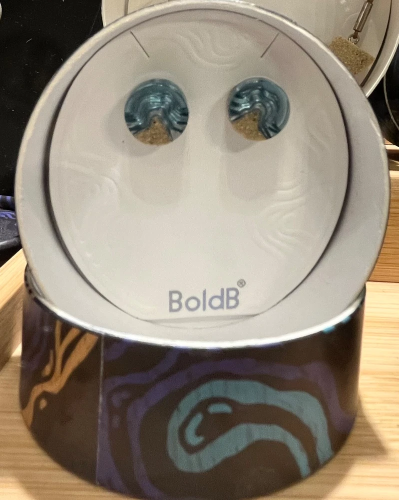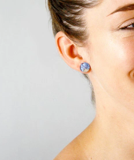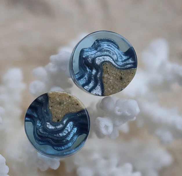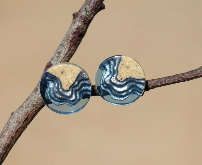 BoldB Shoal Stud Earrings. Shoal - a submerged sandbank exposed at low tide -Our Shoal Ear Studs have been carefully handmade from bonded beach sand, ultramarine blue resin and metal pigments with a high-gloss polished finish -A metal ear post has been attached to a shallow recess on the back of each earring -All metal parts are rhodium plated The earrings have been designed in Melbourne, Australia, and carefully handmade in the Philippines.