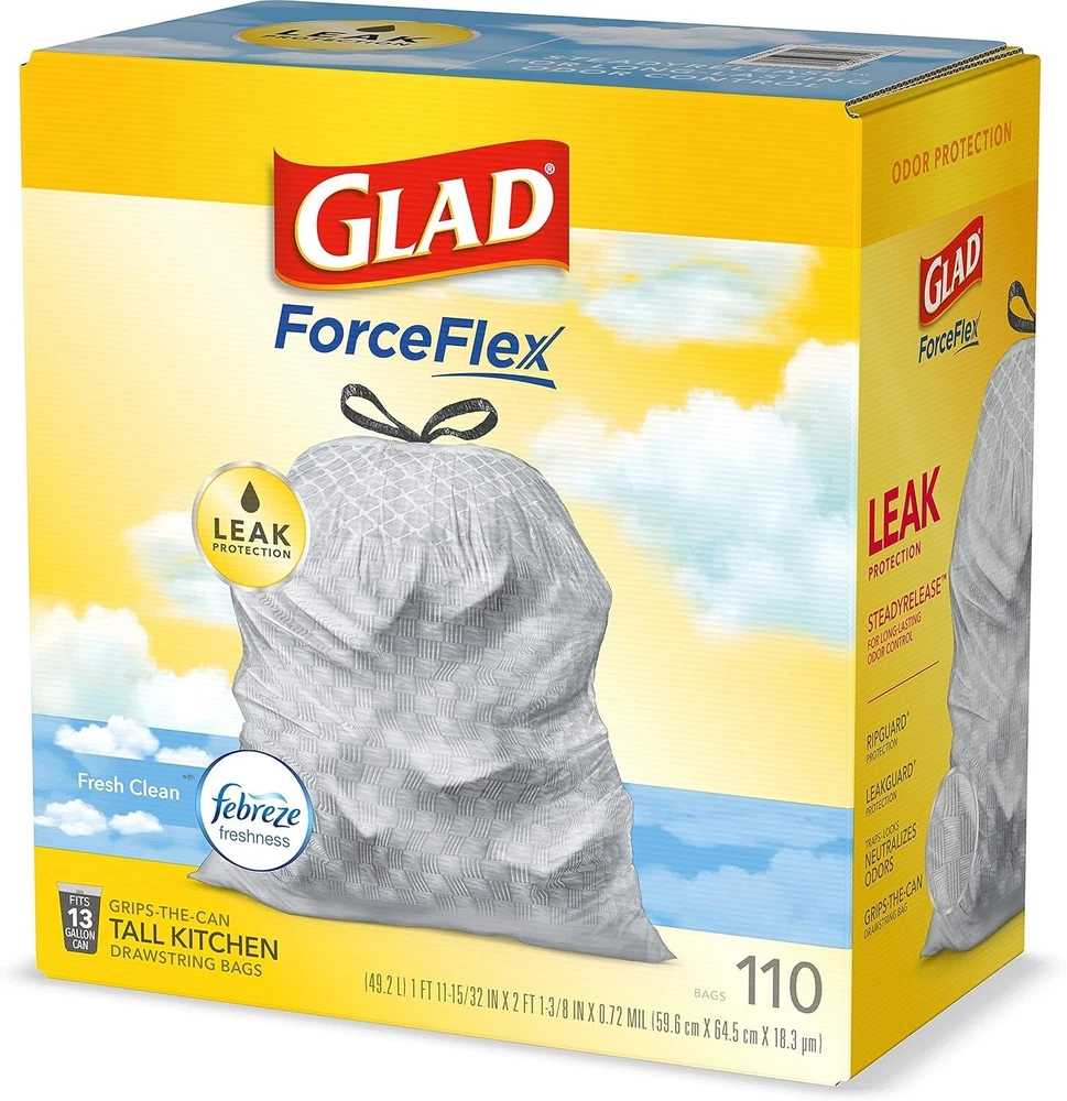 Let the stretchable strength of Glad ForceFlex handle all the messes our busy daily life can throw at it and then some. Glad Tall Kitchen Drawstring Trash Bags are designed with ForceFlex technology to give extra flex as it expands around sharp edges and heavy loads, so you can pack it in while resisting tears, rips and punctures. These trash bags are designed with two layers for extra leak protection. RipGuard and LeakGuard technology prevent seepage of liquids and keep trash contained. Fight nasty kitchen odors with the exclusive Glad trash bag combination of steady release of Febreze freshness and irresistible Gain Fresh Clean scent that traps, locks and neutralizes odors. The durable Grips The Can Drawstring ensures a tight grip on the trash can to keep it in place. Take the trash to the curb with no fear of leaks and tears, and no frustration. FEBREZE and GAIN are used under license from The Procter & Gamble Company or its affiliates.