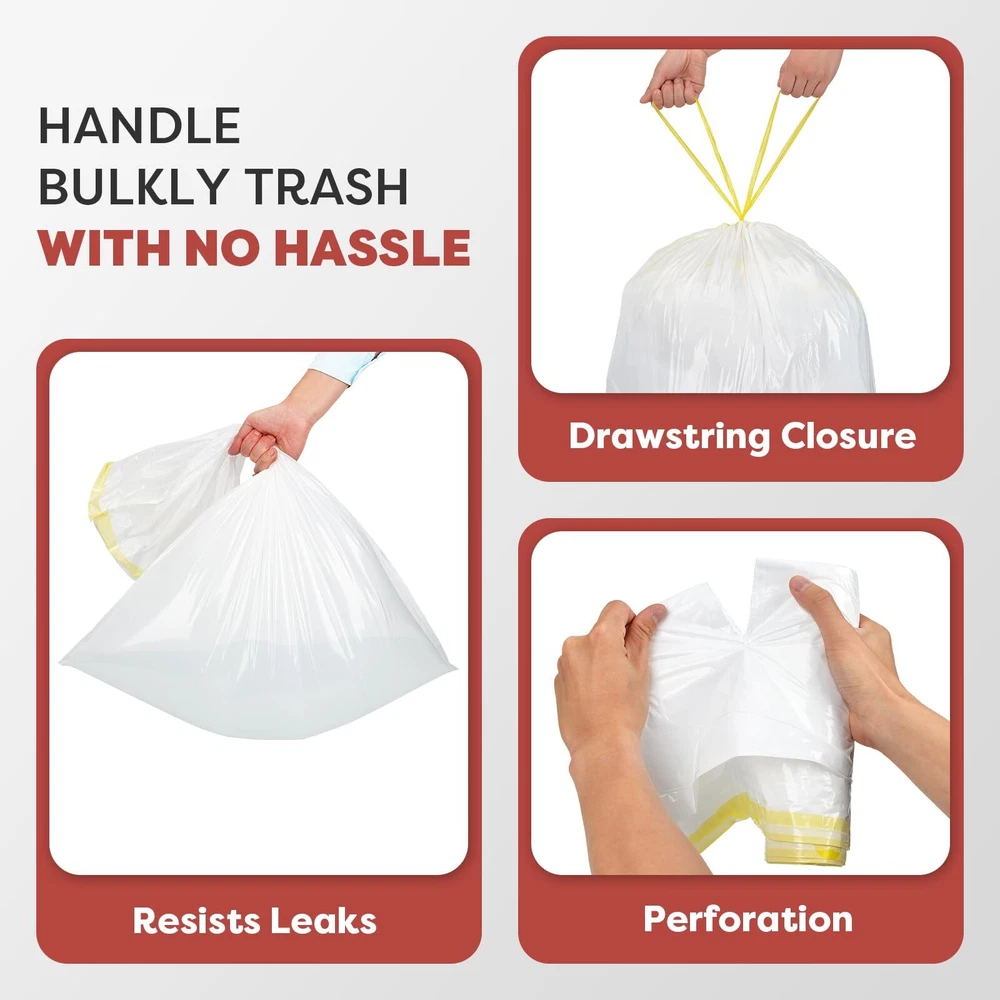 STRETCH MATERIAL - Made of 2 mil extra thick flexible plastic, which is stretch enough to make these trash bags sturdy even overfilled, reliable for your daily sanitary disposal LARGE CAPACITY - These 15 gallon garbage bags are sized at 25.2 x 30.3 inches, will fit 13 gallon, 14.5 gallon, 15 gallon and 16 gallon trash cans with opening circumference of less than 47.5 inches and height less than 26.3 inches, slightly larger than the regular name brand tall kitchen trash bags, which makes it easy to line the entire can and hold more trash DRAWSTRING CLOSURE - Designed with easy to use drawstrings, making these trash bags convenient for lifting, tying, and carrying, this smart design also helps to control odor and eliminate smells in the kitchen. The perforated rolls also brings an easier dispense experience STRONG & RELIABLE - These ultra thick 15 gallon trash bags provide great strength and strecth, resistance to leaks, punctures and rips MULTI-PURPOSE - These garbage bags are suitable for square and round shape trash cans, great for kitchen, yard, office and commercial waste, they can be also used for household storage and laundry room VALUE PACK - Includes 3 rolls / 60 bags in total