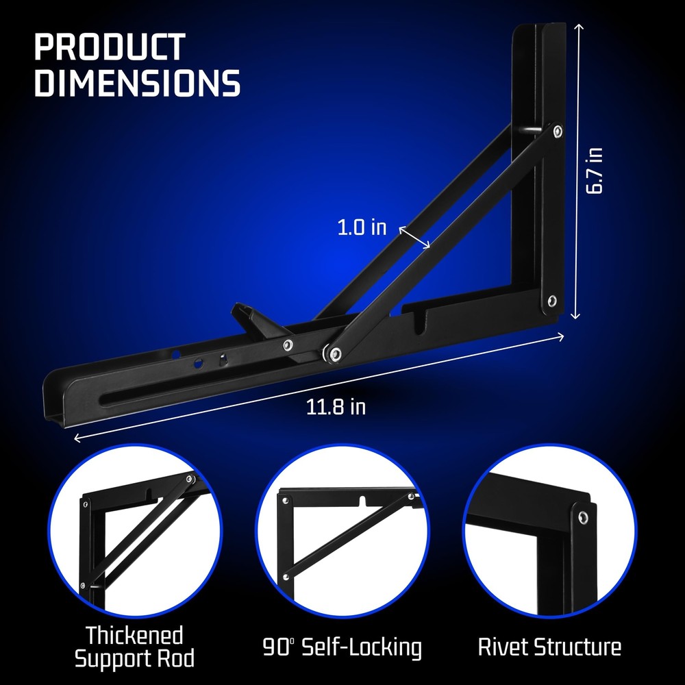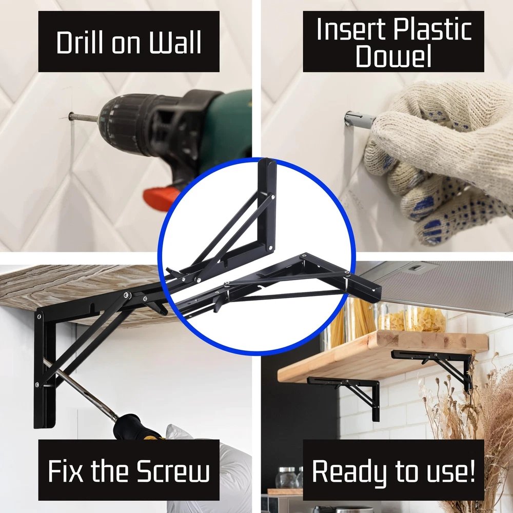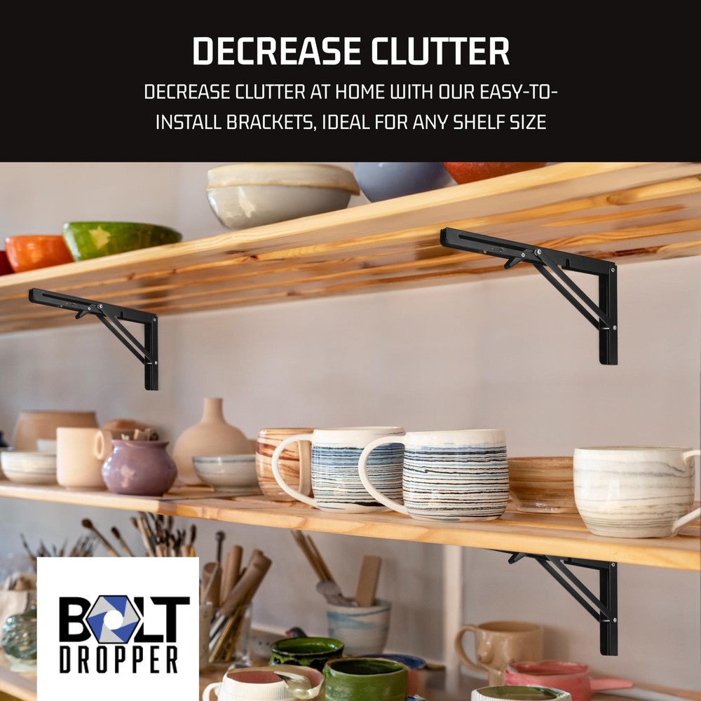 Bolt Dropper Heavy Duty Folding Shelf Brackets - Set of 2 Black Foldable Floating Shelves - Adjustable Support for Wall Mounted Brackets - Stainless Steel Collapsible Bracket with Hinge - Space Saving Space-Saving Solution: Unveil the magic of our folding shelf brackets, providing a pragmatic solution to conserve space in your dwelling or workplace. The 90 degree self-locking folding hinge facilitates an effortless fold when not in use, ensuring immaculate style with function Durable and Sturdy: A concoction of high-grade materials contributes to an enduring structure of our locking hinge equipped brackets. Appropriate for every corner of your home, be it your garage, warehouse, or kitchen Easy to Install: Our drop leaf support brackets are user-friendly, just attach to the wall and fold down to form a firm platform for your shelf. The package incorporates all indispensable hardware so you can mount it without any hassle Versatile Design: Our folding shelf brackets are thoughtfully crafted to cooperate with a spectrum of shelf sizes and arrangements. No matter if you require a compact shelf for your kitchen spices or a larger one for tools, our brackets can accommodate your needs Satisfaction Guaranteed: We believe in our products and their quality. Our primary goal is to offer high-quality folding shelf brackets with exceptional service to our customers. Have faith in us when making a purchase, your satisfaction is our ultimate achievement. Shipping We offer FREE shipping on all orders! We ship within Three business days of payment, usually sooner. We use a selection of shipping services such as UPS, FedEx, USPS etc. We only ship to the lower 48 states, no APO/FPO addresses or PO Boxes allowed. Local pickups and combined shipping options are not provided at this time. Return You can return a product for up to 30 days from the date you purchased it. Any product you return must be in the same condition you received it and in the original packaging. Please keep the receipt. Payment We accept payment by any of the following methods: PayPal Please pay as soon as possible after winning an auction, as that will allow us to post your item to you sooner! Feedback Customer satisfaction is very important to us. If you have any problem with your order, please contact us and we will do our best to make you satisfied. Contact Us If you have any queries, please contact us via ebay. We usually respond within 24 hours on weekdays. Please visit our eBay store to check out other items for sale! Thank you for shopping at our store.