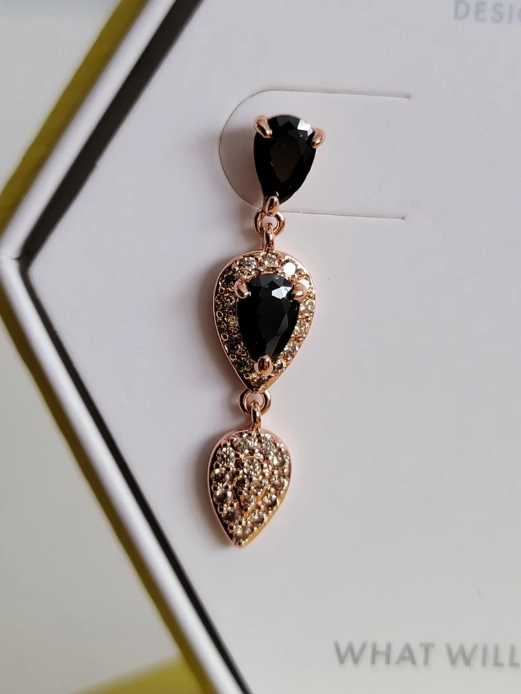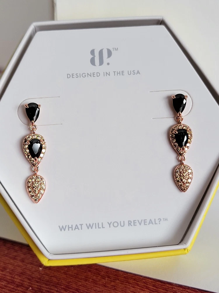 Bomb Party BORG Earrings RBP 5891 "The Thrill of the Day" Black Onyx Cubic Zirconia, Rose Gold Plating. New, never worn, in original box. Ships USPS Ground Advantage.