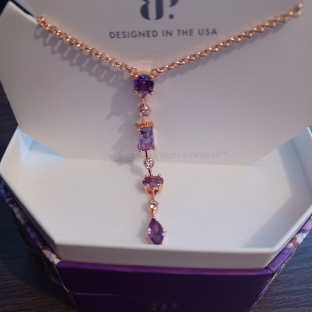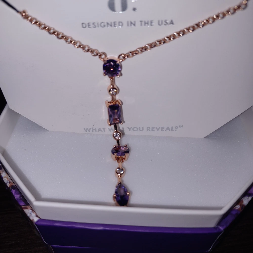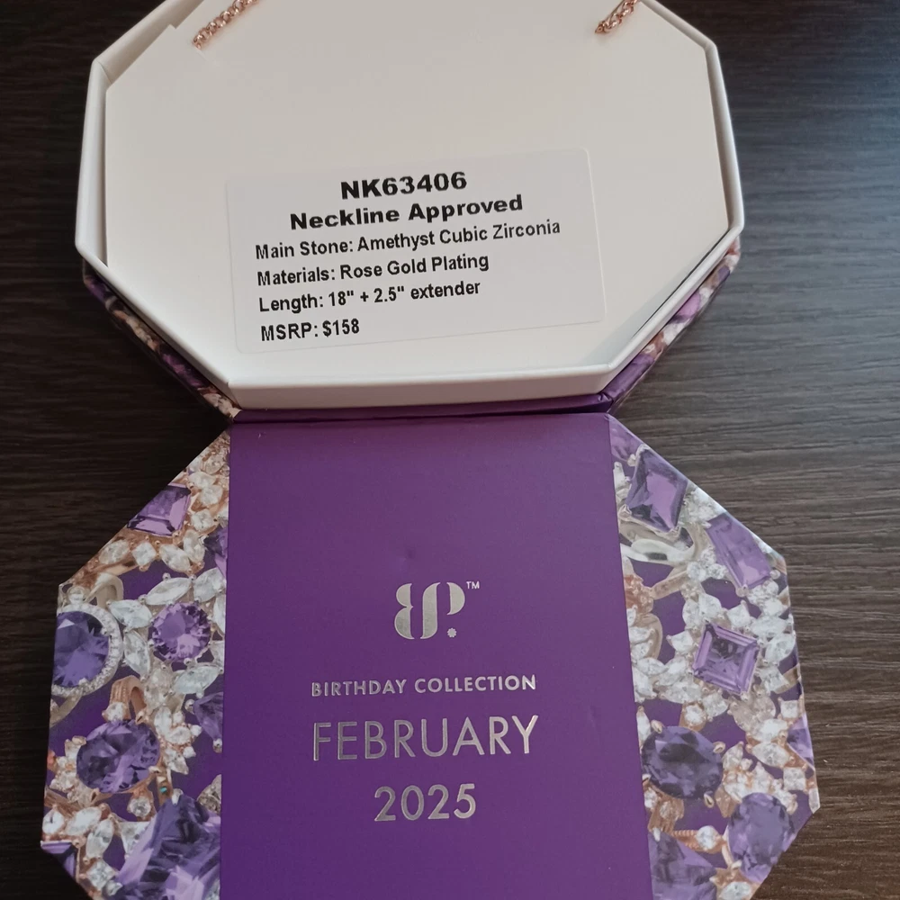 Bomb Party February Birthday Collection 2025 Necklace, NK63406, Amethyst Cubic Zirconia Neckline Approved Rose Gold Plating 18" + 2.5" extender