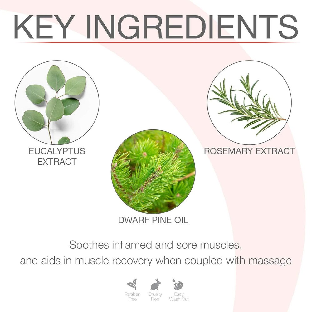 "Old world"recipe designed to penetrate deep within the skin and increase blood circulation to calm inflamed and sore muscles and aid in muscle recovery Soothes soreness in muscles caused by, fibromyalgia, strains, and general aches with carefully selected healing ingredients that repair dry skin and aid in relaxation during a full body massage, back massage, or neck massage Scents of Rosemary, Peppermint, Eucalyptus, Melissa, and Chamomile essential oils aid in relaxation, Dwarf Pine Oil intensifies a back massage or neck massage with a light warming sensation to further ease muscle aches High viscosity and luxurious texture provides gentle glide and the perfect amount of friction and workability for your most sensational massage, making it ideal for Swedish, Deep Tissue, Sports, and Shiatsu massages Pumpable for your convenience, water dispersible for quick and easy cleanup, scented for relaxation, paraben free, cruelty free, gluten free, no nut oils OPEN LID, BUT FULL