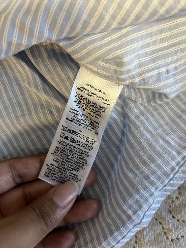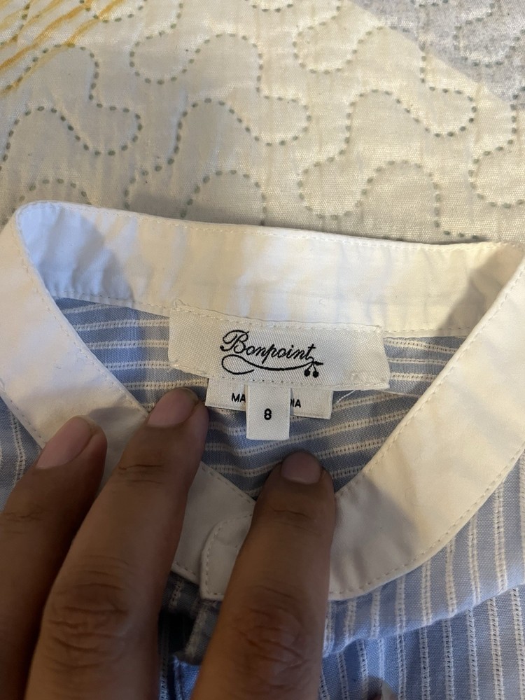 Measurements and conditions as shown in photos The Bonpoint Size 8 Striped Button Shirt in blue and white is a stylish and classic piece perfect for young boys. Made from cotton, this dress shirt features a collared neckline and button closure for a polished look. Ideal for special occasions or everyday wear, this shirt is designed with a timeless striped pattern that adds a touch of sophistication to any outfit.