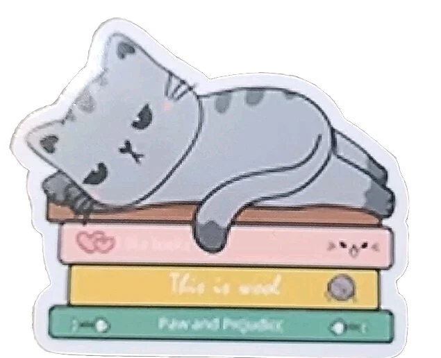 The product is a set of 10 diary, planner, or scrapbook stickers featuring cats, books, plants, reading, and bookish themes.