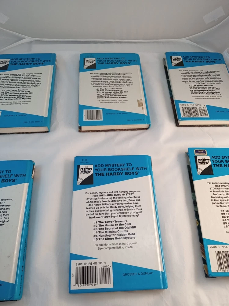 This lot consists of five vintage Hardy Boys books published by Grosset & Dunlap. The books are hardcover and written in English by Franklin W Dixon. They belong to the Antiquarian & Collectible category and are perfect for fans of the Hardy Boys character family. The books are in good condition and are a great addition to any book collection.