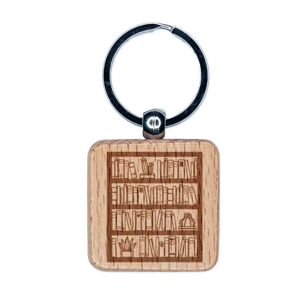 Bookcase of Books Engraved Wood Square Keychain Tag Charm