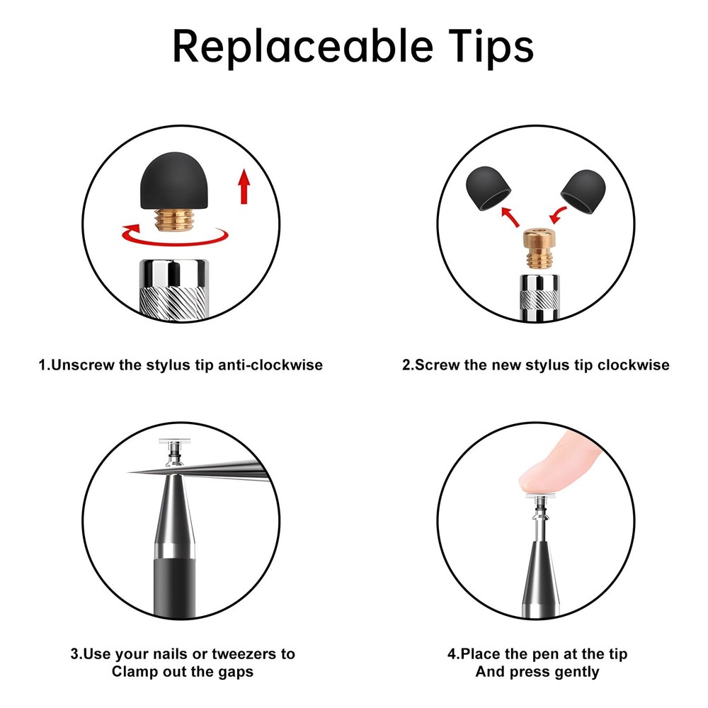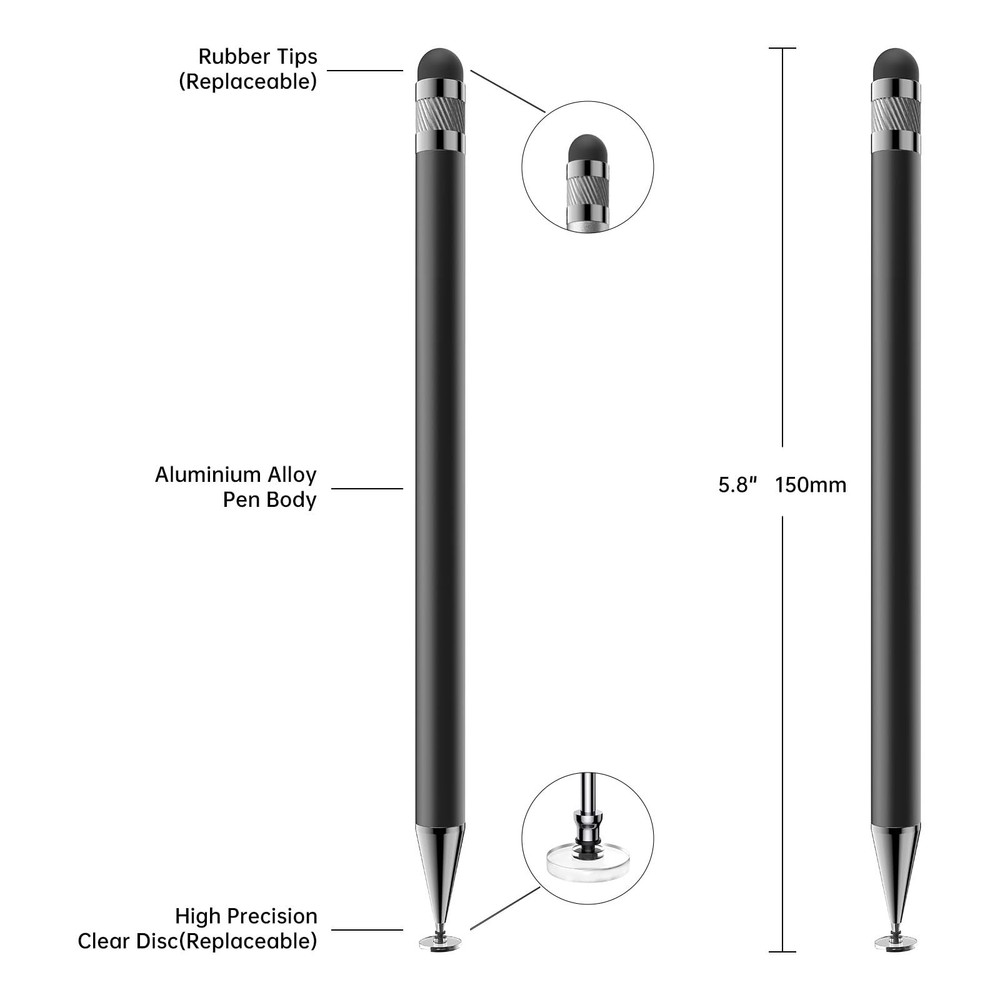 Bopomofo Stylus (5 Pcs),2-in-1 Stylus Pen for Touchscreen, High Precision and Sensitivity, Suitable for iPhone/ipad/Android Tablets, Compatible with All Touch Screens,Black 【Stylus Pen for Touchscreen】This stylus can be used on touch screen, designed to replace your fingers, the stylus can free up your fingers and provide higher sensitivity and response on the screen. 【2-in-1 Stylus Pen】Tablet pen for touch screen, made of lightweight alloy, no need for Bluetooth connection or charging, ready to use after opening the package, comfortable in hand, sturdy, durable and anti-aging, so you can use it anytime, anywhere Easily capture inspiration and make everything feel like writing on paper, giving you a more accurate writing/drawing/touching experience. 【High Accuracy and High Sensitivity】The stylus adopts a flexible transparent disc tip that can flexibly fit on the screen without leaving disconnected lines on your tablet or phone, providing better flexibility and accuracy, Allowing you to see exactly where the mark is and giving an accurate point, while the rubber tip and disc tip can give you two different touch experiences. 【Compatibility and Multi-Purpose】Universal stylus, suitable for touch screen devices (Apple, Samsung, Moto, Lenovo, Xiaomi, etc., and also compatible with major operating systems, such as: Google, Android, Microsoft, etc.), you can use it like a real You can use our stylus to write on drawing applications, take notes, read news, play games, etc., just like any other touch screen device. 【What You Get】You will get 5 black stylus pens and a set of 6 rubber pen tips and 3 disc transparent tips.If you have any questions about the stylus, please feel free to contact our customer service team, We will solve it for you as soon as possible.