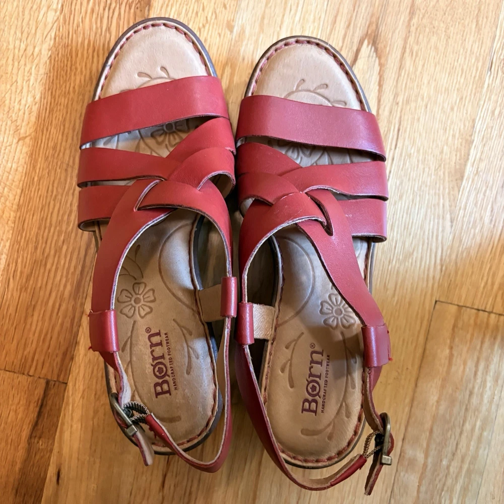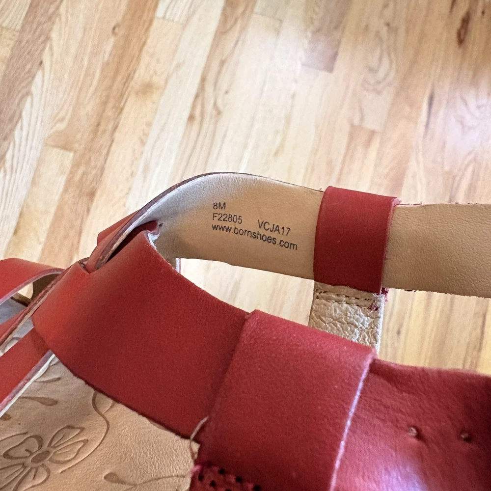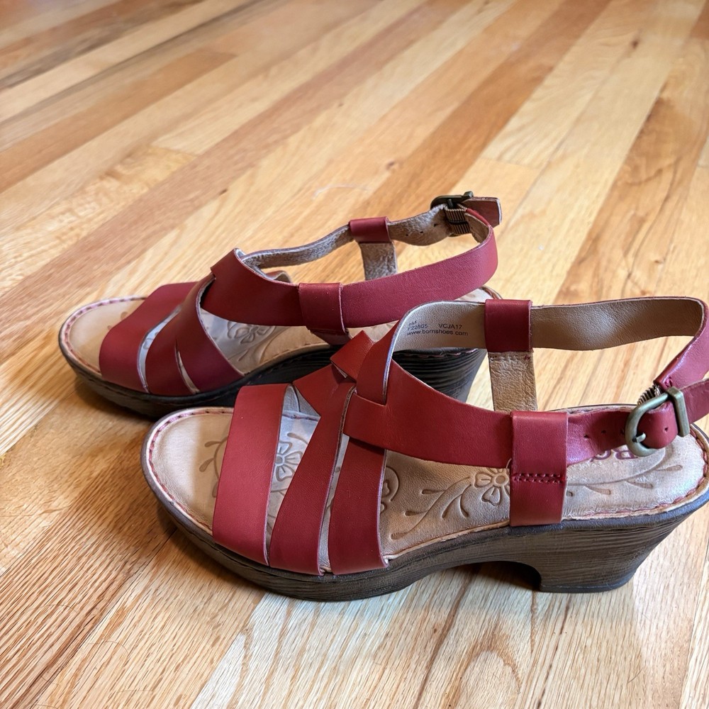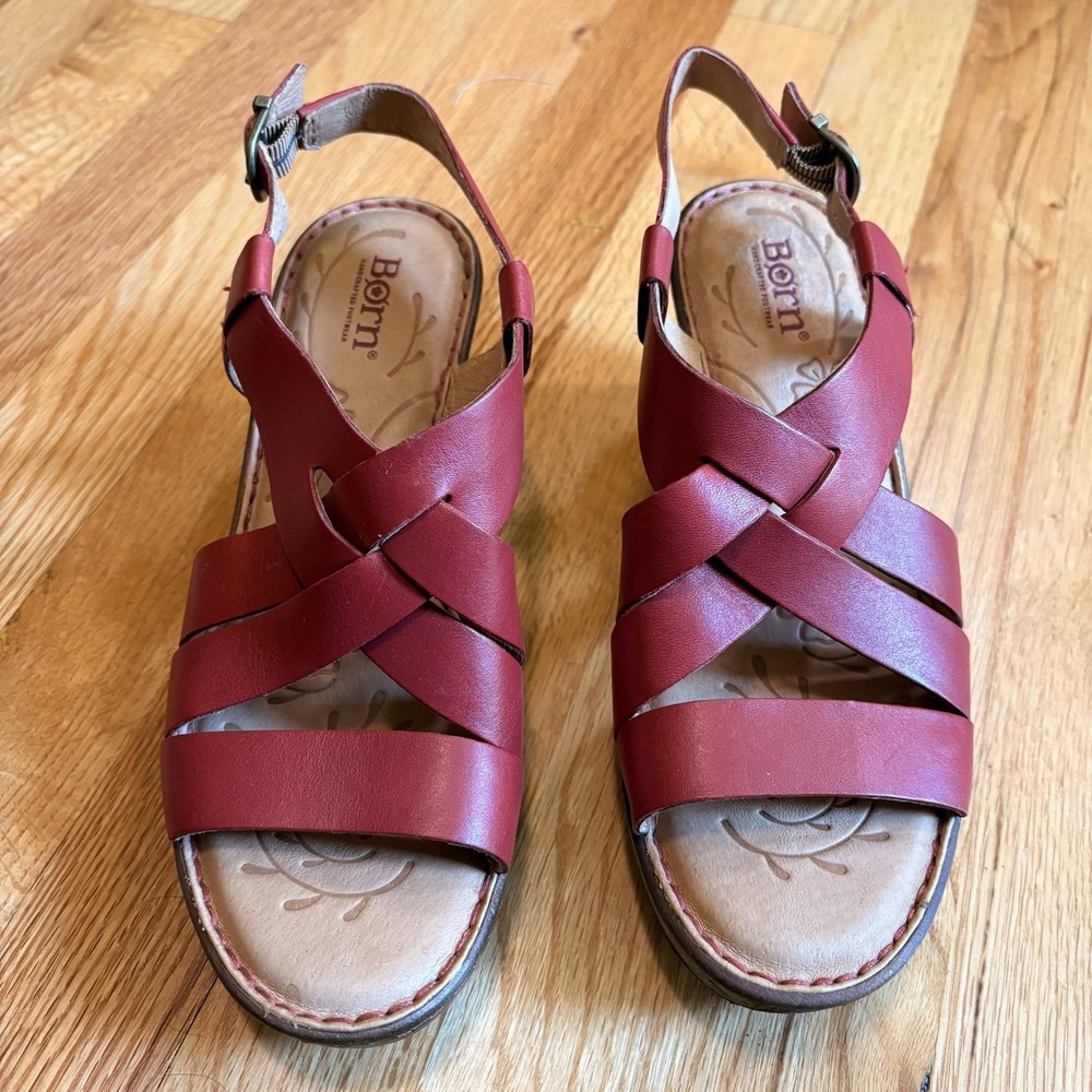 Country of Origin: Vietnam Shoe Width: M Style: Strappy Heel Style: Wedge Department: Women gtin13: n/a Lining Material: Leather Outsole Material: Manmade US Shoe Size: 8 UPC: n/a Occasion: Casual Color: Red Heel Height: Mid (2-2.9 in) Upper Material: Leather Type: Sandal Pattern: Solid Model: Carmo Features: Not Specified Brand: Børn Closure: Buckle Theme: Cross MPN: n/a
