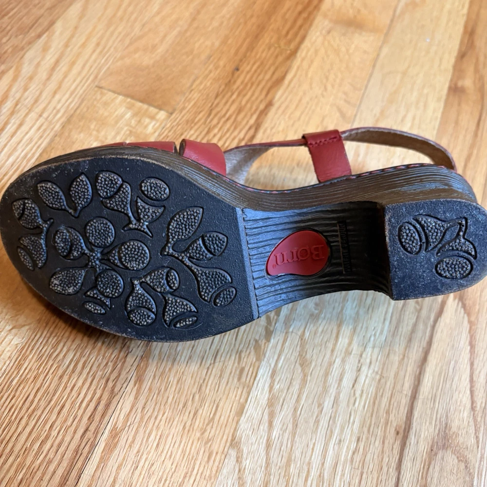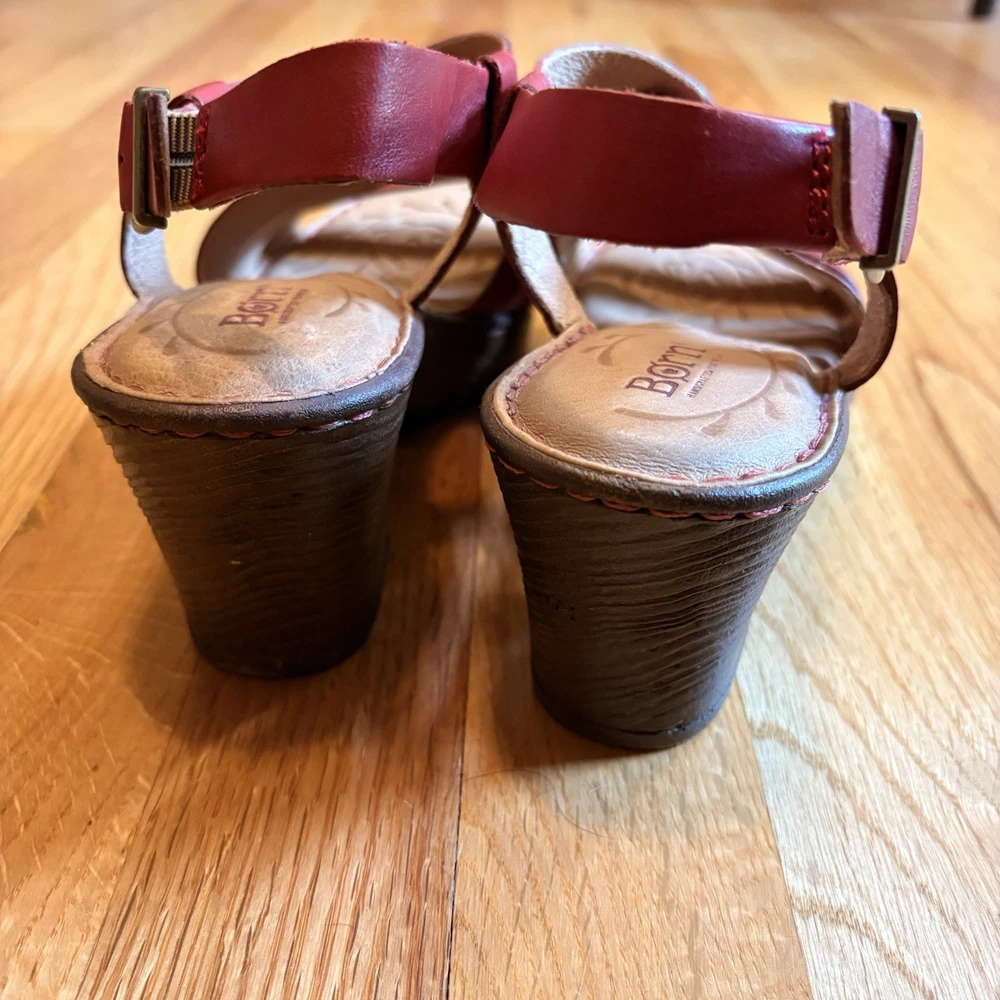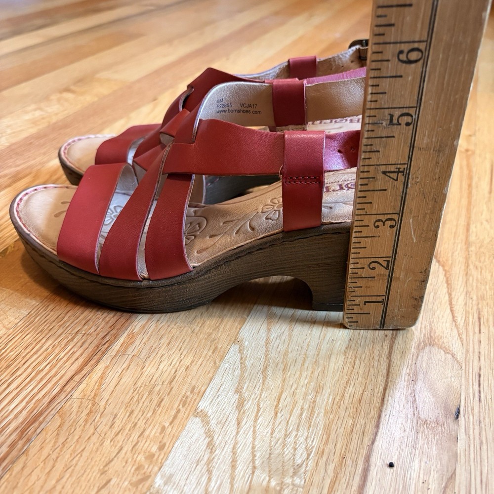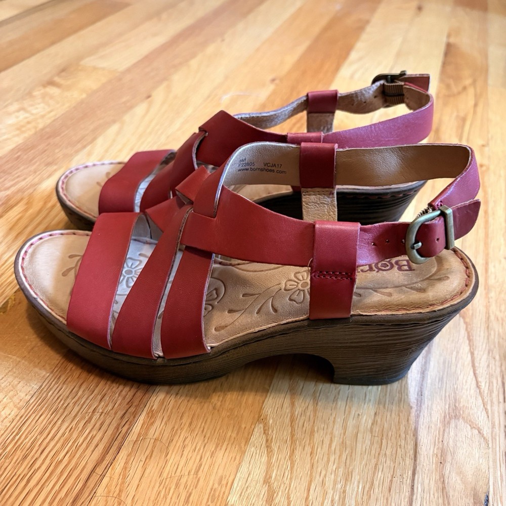 Country of Origin: Vietnam Shoe Width: M Style: Strappy Heel Style: Wedge Department: Women gtin13: n/a Lining Material: Leather Outsole Material: Manmade US Shoe Size: 8 UPC: n/a Occasion: Casual Color: Red Heel Height: Mid (2-2.9 in) Upper Material: Leather Type: Sandal Pattern: Solid Model: Carmo Features: Not Specified Brand: Børn Closure: Buckle Theme: Cross MPN: n/a
