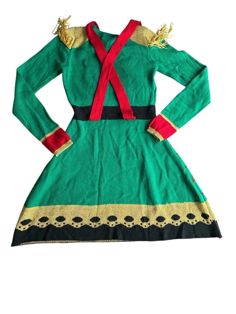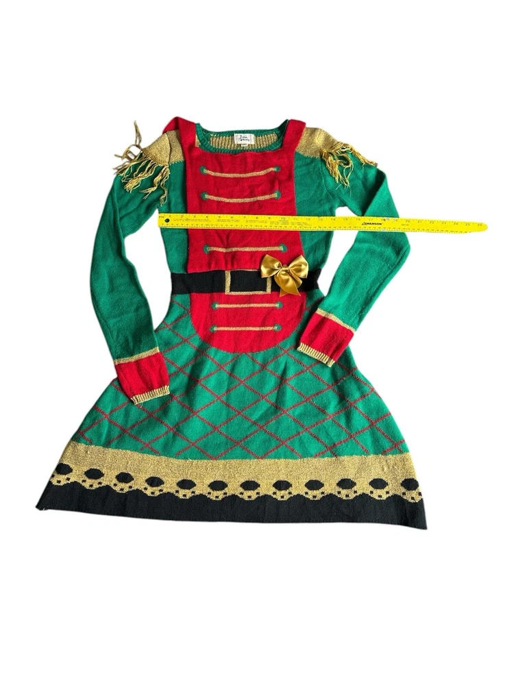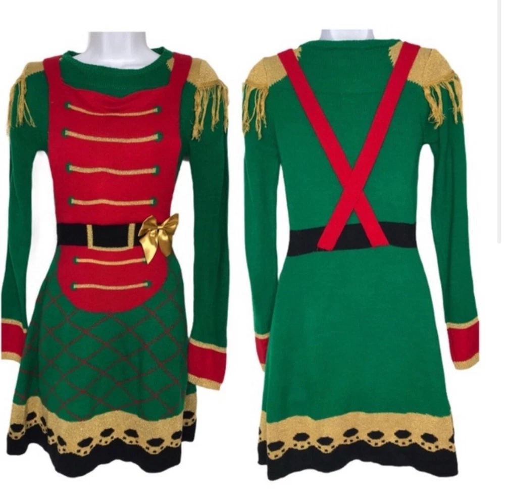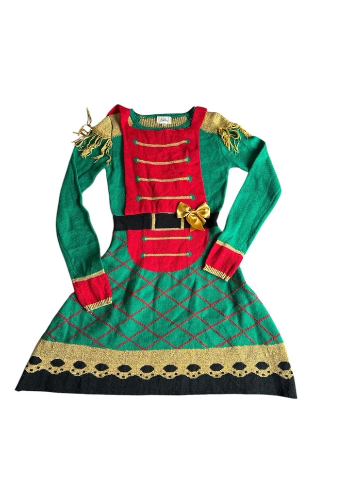 This Born Famous sweater dress is perfect for the holiday season. With a festive green, red and gold design featuring a nutcracker toy soldier pattern, this dress will make you stand out at any party or cocktail event. Made from an acrylic blend, this midi-length dress has long sleeves and a comfortable regular fit, making it a great addition to your winter wardrobe. The dress is available in size XS and is suitable for women of all ages. The brand is known for its high-quality clothing and this sweater dress is no exception. Whether you're looking for a stylish way to celebrate the holidays or simply want to add a unique piece to your wardrobe, this Born Famous sweater dress is the perfect choice. Inventory 040