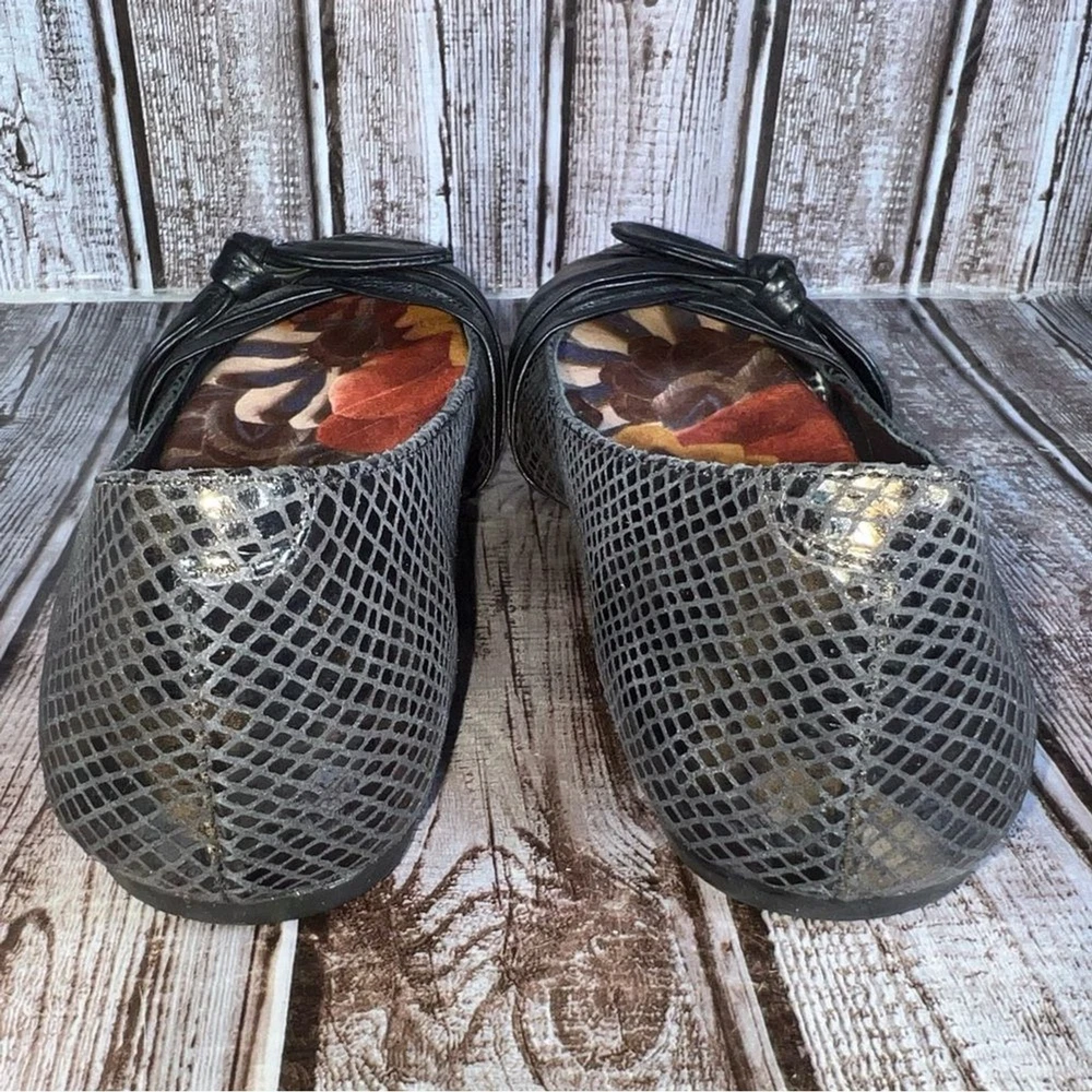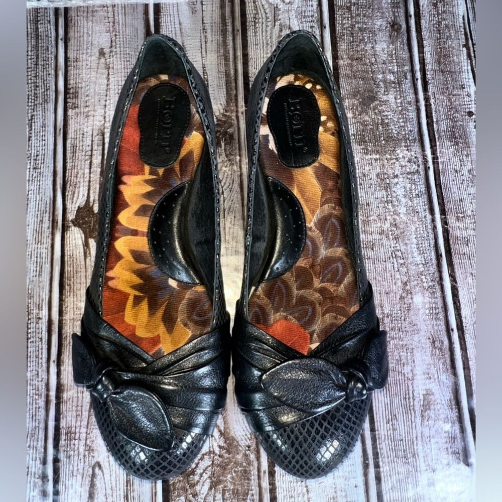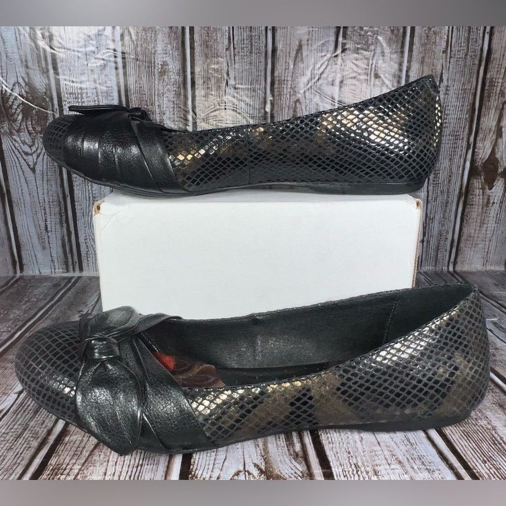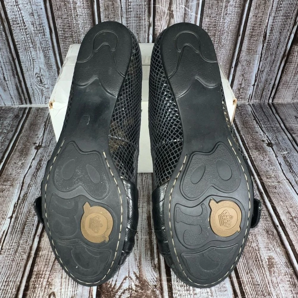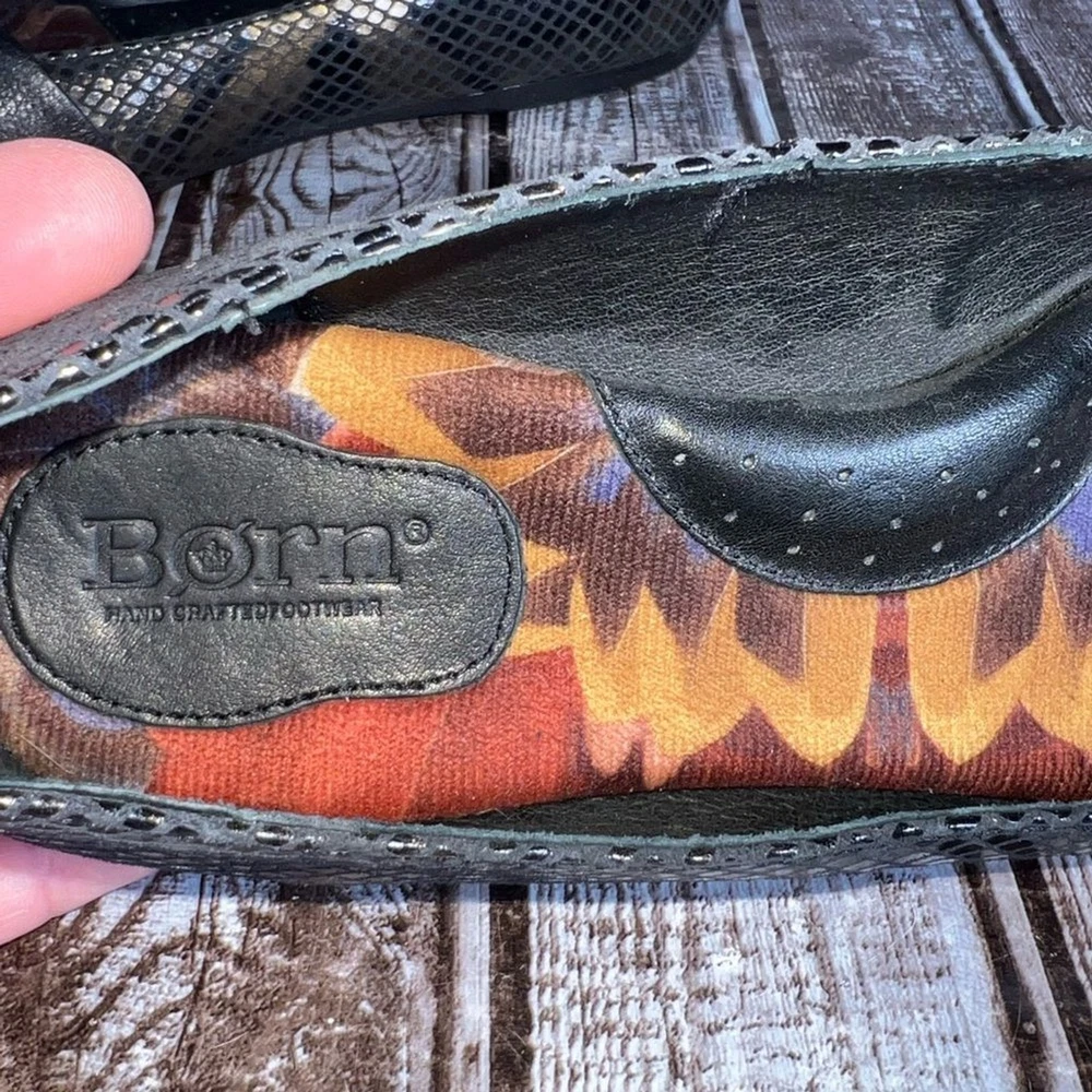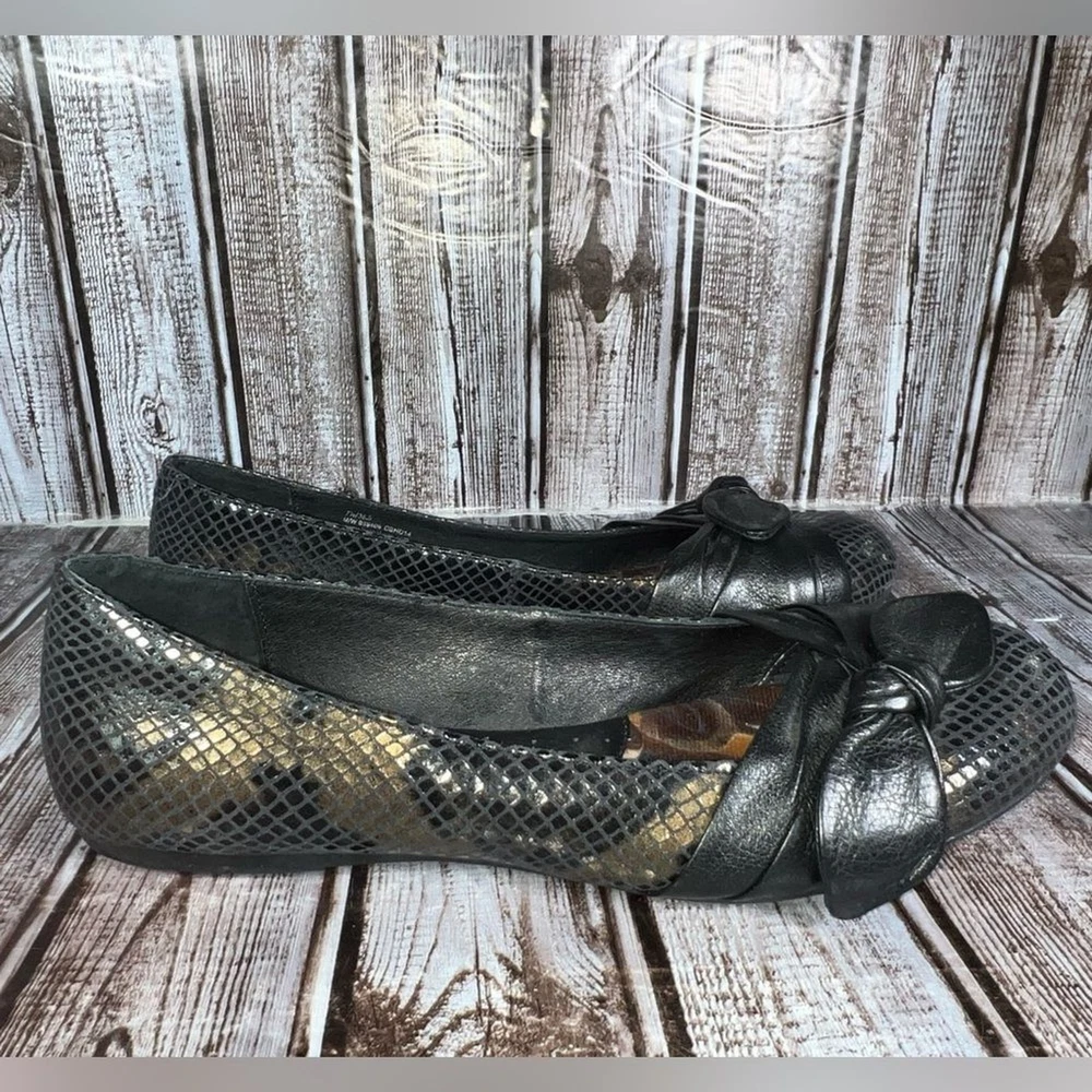 Born shoes are well known for their premium materials and supportive construction. Designed with a textured snake-embossed leather upper and a classic bow detail, these flats are both stylish and comfortable for everyday wear. Features: Size: 7.5 Genuine leather upper Snake-embossed black/gray finish Bow accent Cushioned footbed Durable rubber sole Condition: Pre-owned, gently worn. Light wear on soles consistent with normal use. Please review all photos.