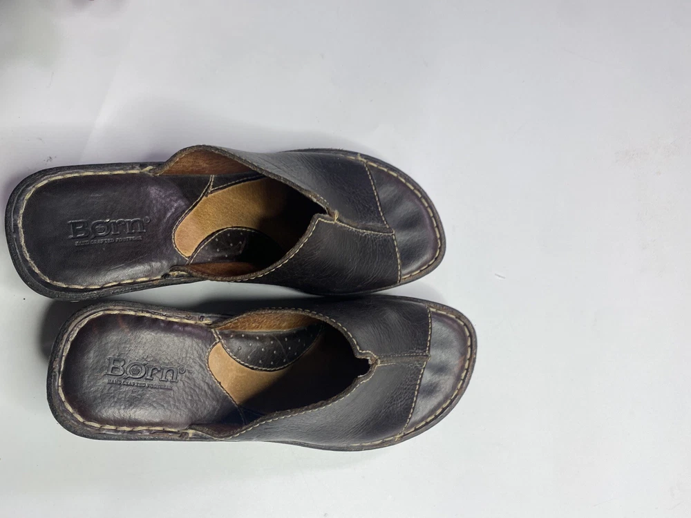 Born Women's Mule Size 7 EU 38 Clog Low Wedge Slip On Shoe Brown Leather Hippie. Condition is Pre-owned. Shipped with USPS Ground Advantage.