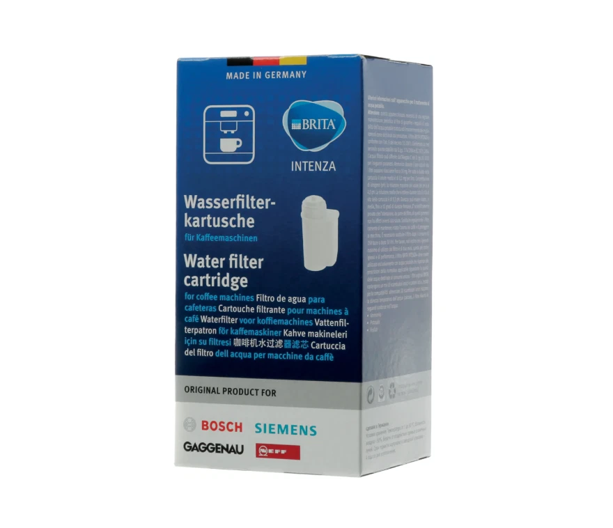 Bosch Brita Intenza 17000705 Water Filter for Coffee Machines 1) Water filter cartridge for coffee machines. 2) Protects your device from limescale, chlorine, lead and copper. 3) Improves the taste and aroma of your coffee. 4) Adjustable according to water hardness. 5) Always remove the filter before running your device in the descaling program and replace it after 50 litres of use (400 cups or every two months).