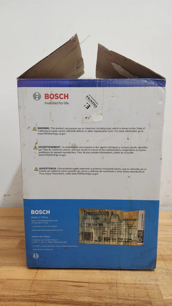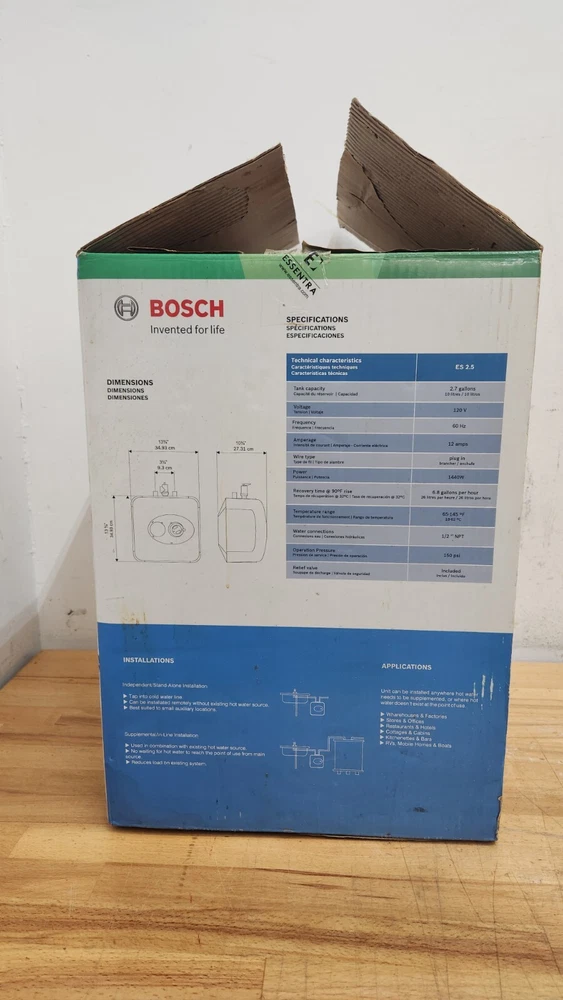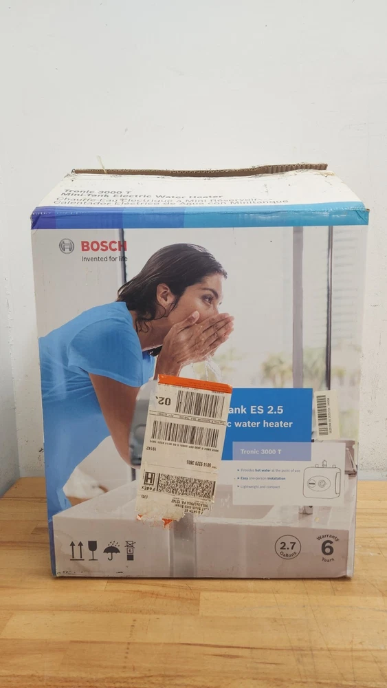NEW Bosch Electric Mini-Tank Water Heater Tronic 3000 T 2.5-Gallon (ES 2.5) New, never used. Packaging has some shelf wear like marks and stains but contents remain in great shape otherwise. See photos for details. Comes with only what is pictured, unless otherwise stated Please ask questions BEFORE you bid I Do Not Offer Buy it Now Prices On Auctions If you have any problems with the item please message me and we will work our hardest to resolve the issue Our eBay department is open 10am-6pm Monday to Friday (EASTERN). This is when items get shipped and questions get answered. We are not available to answer questions or ship on weekends or holidays. Payment Information Please check your local tax laws to determine if there is an online sales tax for out of state purchases Payment can be made either through eBay, or as cash upon local pickup Unpaid item cases will be opened 4 days after auction ends Shipping Information Item location: Glassboro, New Jersey My processing and handling time is 1 business days, however I try to ship within 24 hours of the payment being received. We only ship to the address used when purchasing the item. Return Policy Return shipping - Seller pays return shipping. However, if an item is being returned due to buyer remorse, the original shipping charge will not be refunded. Items that are used or damaged by the buyer are subject to a deduction in refund in accordance to eBay policy, per their guidelines: https://www.ebay.com/help/selling/managing-returns-refunds/handle-return-request-seller?id=4115#refund_guidelines