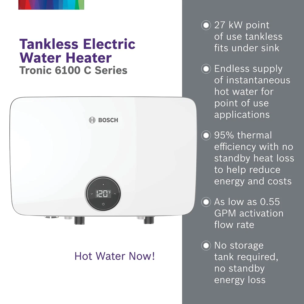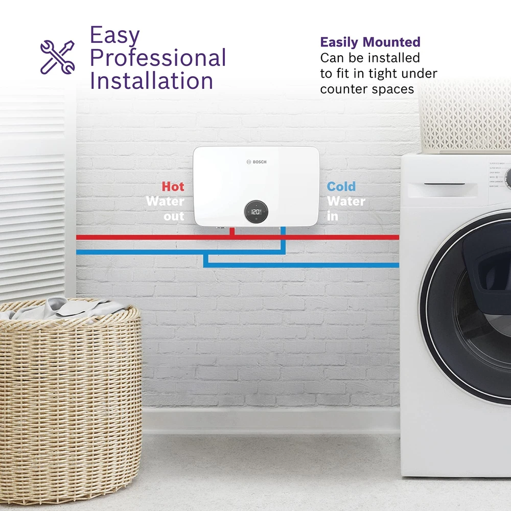 Technical Details Brand Bosch Thermotechnology Product Dimensions 8.5"W x 13"H Special Feature Lightweight Color White Wattage 27000 watts Maximum Flow Rate 0.14 Cubic Meters Per Minute Efficiency 95% thermal efficiency Mounting Type Wall Is Electric Yes Manufacturer Bosch Thermotechnology Item Depth [SMALL] UPC 052575112992 Part Number 7738007421 Item Weight 17.26 pounds Country of Origin China Item model number 7738007421 Item Package Quantity 1 Special Features Lightweight Included Components Electric Tankless Water Heater Batteries Required? No COMPACT AND LIGHTWEIGHT: Effortlessly fits under sinks GREAT FOR LOW-FLOW FAUCETS: With as low as a 0.55 GPM activation flow rate, it's perfect for commercial low-flow faucets in shopping malls, airports, stadiums, offices, and more EFFICIENT AND DURABLE: 96% thermal efficiency with no standby heat loss to save you time, water, and money, and comes incased in a durable white plastic housing that blends in with existing décor As low as .55 GPM activation flow rate 5 year limited warranty 3.5 KW TANKLESS WATER HEATER: Designed specifically for point of use applications to provide an endless supply of instantaneous hot water for one or more commercial or residential sinks Shipping We offer FREE shipping on all orders! We ship within Three business days of payment, usually sooner. We use a selection of shipping services such as UPS, FedEx, USPS etc. We only ship to the lower 48 states, no APO/FPO addresses or PO Boxes allowed. Local pickups and combined shipping options are not provided at this time. Return You can return a product for up to 30 days from the date you purchased it. Any product you return must be in the same condition you received it and in the original packaging. Please keep the receipt. Payment We accept payment by any of the following methods: PayPal Please pay as soon as possible after winning an auction, as that will allow us to post your item to you sooner! Feedback Customer satisfaction is very important to us. If you have any problem with your order, please contact us and we will do our best to make you satisfied. Contact Us If you have any queries, please contact us via ebay. We usually respond within 24 hours on weekdays. Please visit our eBay store to check out other items for sale! Thank you for shopping at our store.