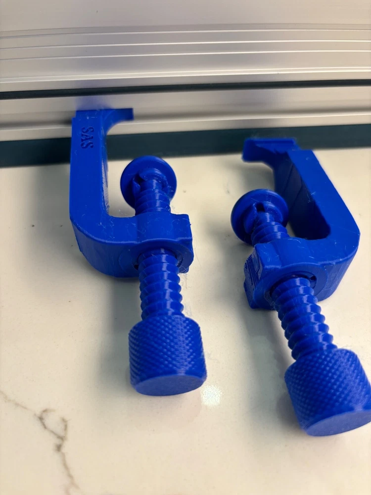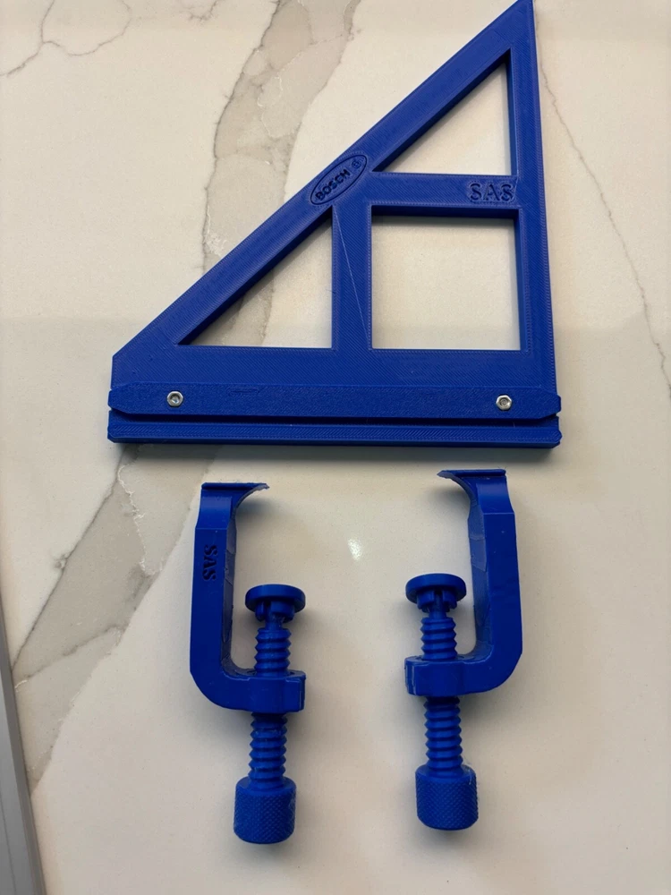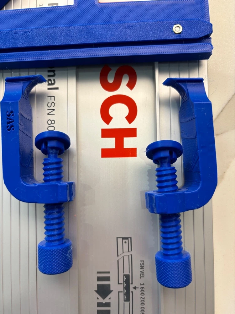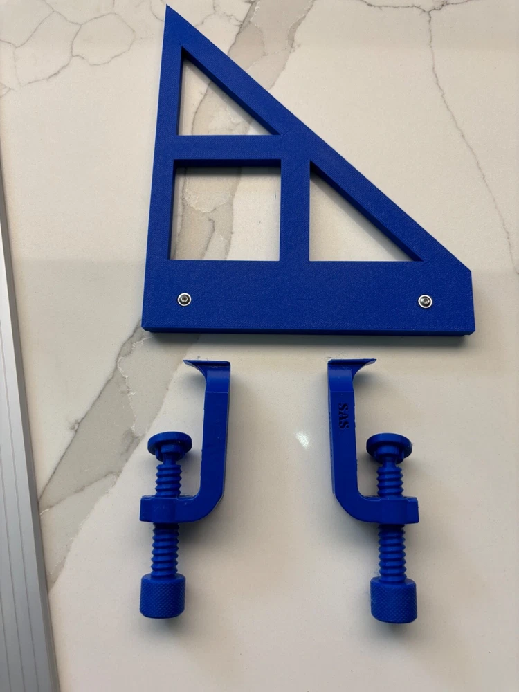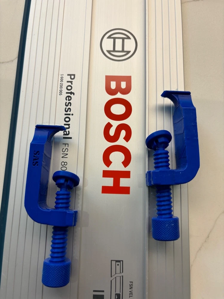 This is a 3 part bundle which will Improve efficiency of your guide rail / track saw setup Set will fit guide rails of the following make: Bosch What is included: (1) One 90 & 45 Degree Large Angle Bevel Guide Rail Stop (2) Two G- Style All In One clamp to fit the Guide Track - very easy to hold down material = perfect for worktops With regards to the large angle bevel Square: If you are looking to make and achieve perfectly square or angled cross cuts with your track saw (plunge saw), then this is what you need. This Track Saw Guide Rail Bevel Square is compatible with the guide rails of above mentioned brand to handle the most accurate and tight tolerances for top quality woodworking when cutting with a rail or track saw. This design fits perfectly to all lengths of profile guide rails of above mentioned brand Slide the Track Saw Square on to the rail and secure the rail to the square firmly in place, by gently tightening the two screws with an allen key Large fence area 90 degree 185mm - 45 degree 230mm to give a solid and sturdy reference Large slider to fit the guide rails to ensure its rock solid, and will give a positive connection Secured in place by two allen screws (included Slides in easy and out, without removing the slider. Increases user safety and reduces risk due to large reference area Please note that there is no OEM product available to do this With regards to the G-Style clamps G- Style clamp to fit the Guide Track from above mentioned brand - very easy to hold down material = perfect for worktops Excellent design and fit Cost effective - its all there, right out of the box This is a complete clamp, no additional stuff needed!! Technical Details Material: PLA Colour may vary (mostly Blue) Made in the UK 3d Printed Infill at 50 -70% Please Note: Guide rail not included