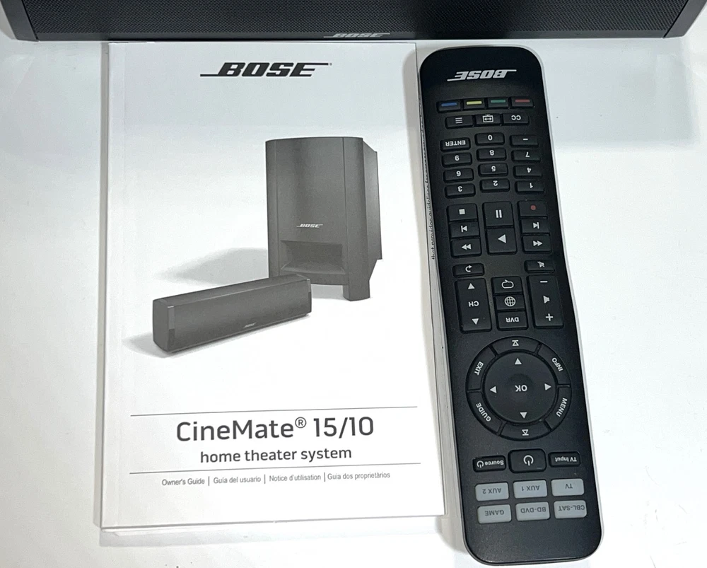 Bose CineMate 15 Home Theater Cinema Speaker System With IR Remote Control, Soundbar, Digital Optical Cable, Power Cords, and Instruction Manual. Batteries not included. Great gently used tested working condition. Minor normal usage wear including 4 small dings/on the top side edges, see pics.