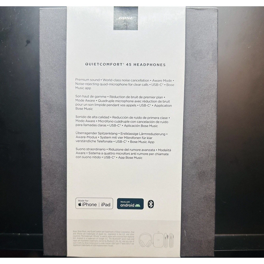 MPN: 8667240200 Wireless Technology: Bluetooth Model: Bose QuietComfort 45 Connectivity: Bluetooth UPC: 17817835022 Type: Ear-Cup (Over the Ear) Features: Active Noise Cancellation Microphone Type: Built-In gtin13: 17817835022 Brand: Bose Color: White Form Factor: Headband Number of Earpieces: Double