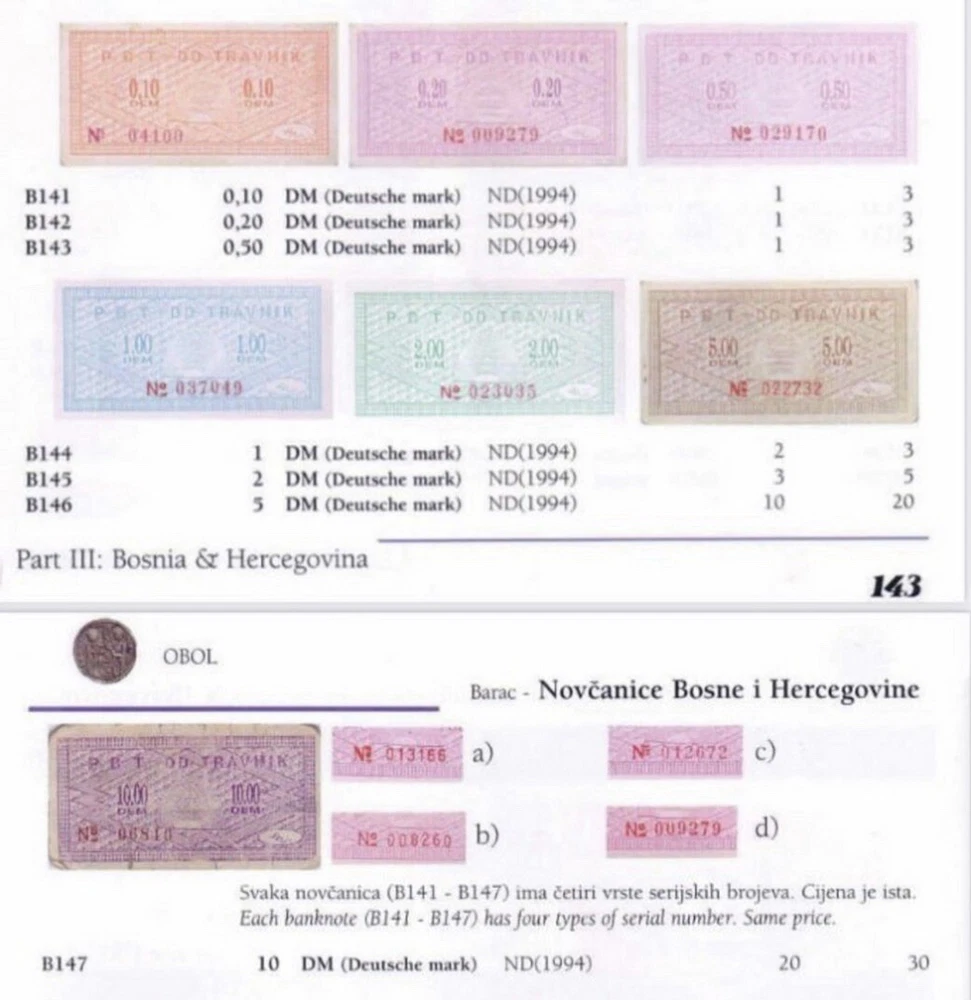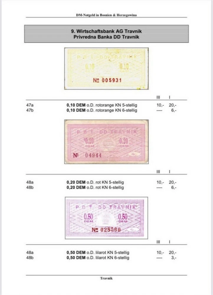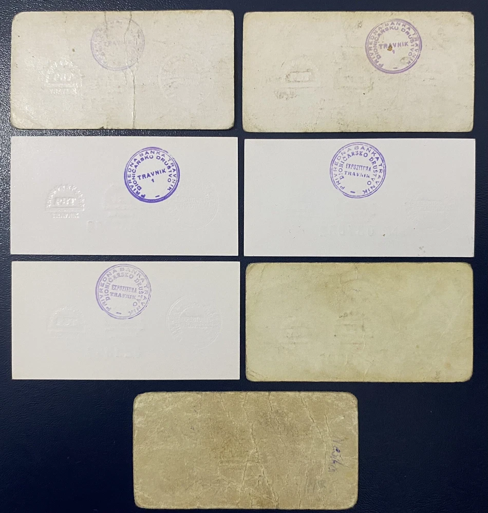 Complete lot of war vouchers of Travnik (Bosnia and Herzegovina) in denominations of 0.10, 0.20, 0.50, 1, 2, 5 and 10 DM (German marks). These vouchers were issued by the local Bosnian authorities of the Travnik district due to a lack of small change. All the vouchers I offer in this lot are guaranteed to be original. I mention this because there are a lot of forgeries that were printed after the war and are always offered in UNC quality. Counterfeits are quite easy to recognize by the stamp on the back of the voucher. In the third picture that I attach to the post, you can see what the original seal looks like (pay special attention to the letter P in the letter "PRIVREDNA...") and in the fourth picture of the post, see what the fake seal looks like (with special attention to the letter P). Original vouchers of 0.5, 1 and 2 DM can be found in UNC condition (as they are in my offer), and as for other vouchers, they are very difficult to find in UNC condition and very few copies are known. So you can be sure that the UNC vouchers of 0.10, 0.20, 5 and 10 DM offered on the market are almost certainly fakes. For more information about these vouchers, see the last two pictures of the post. Assessing the quality of a banknote can be subjective and wrong. Therefore, take a good look at the pictures of the banknote before buying. You will receive what you see in the photo.