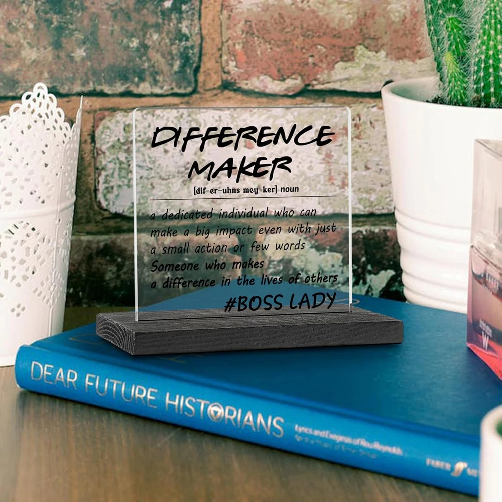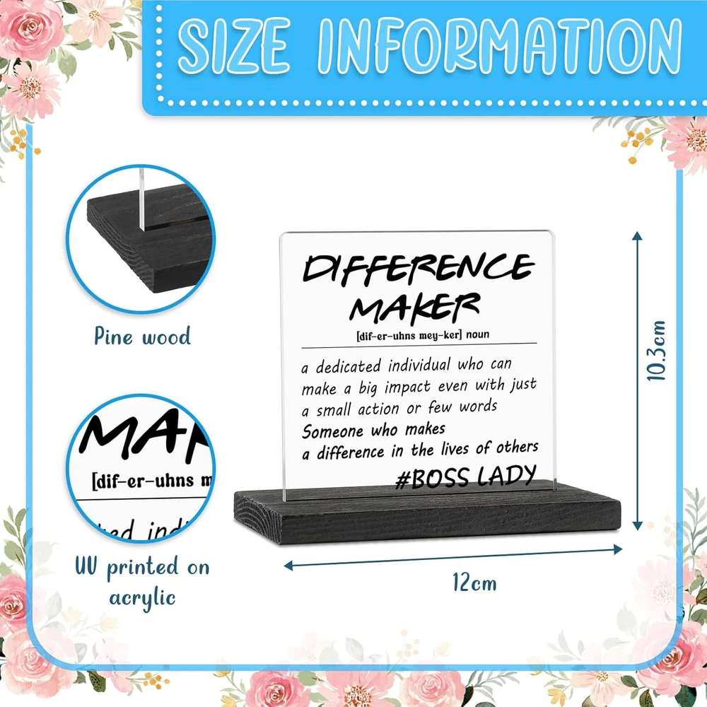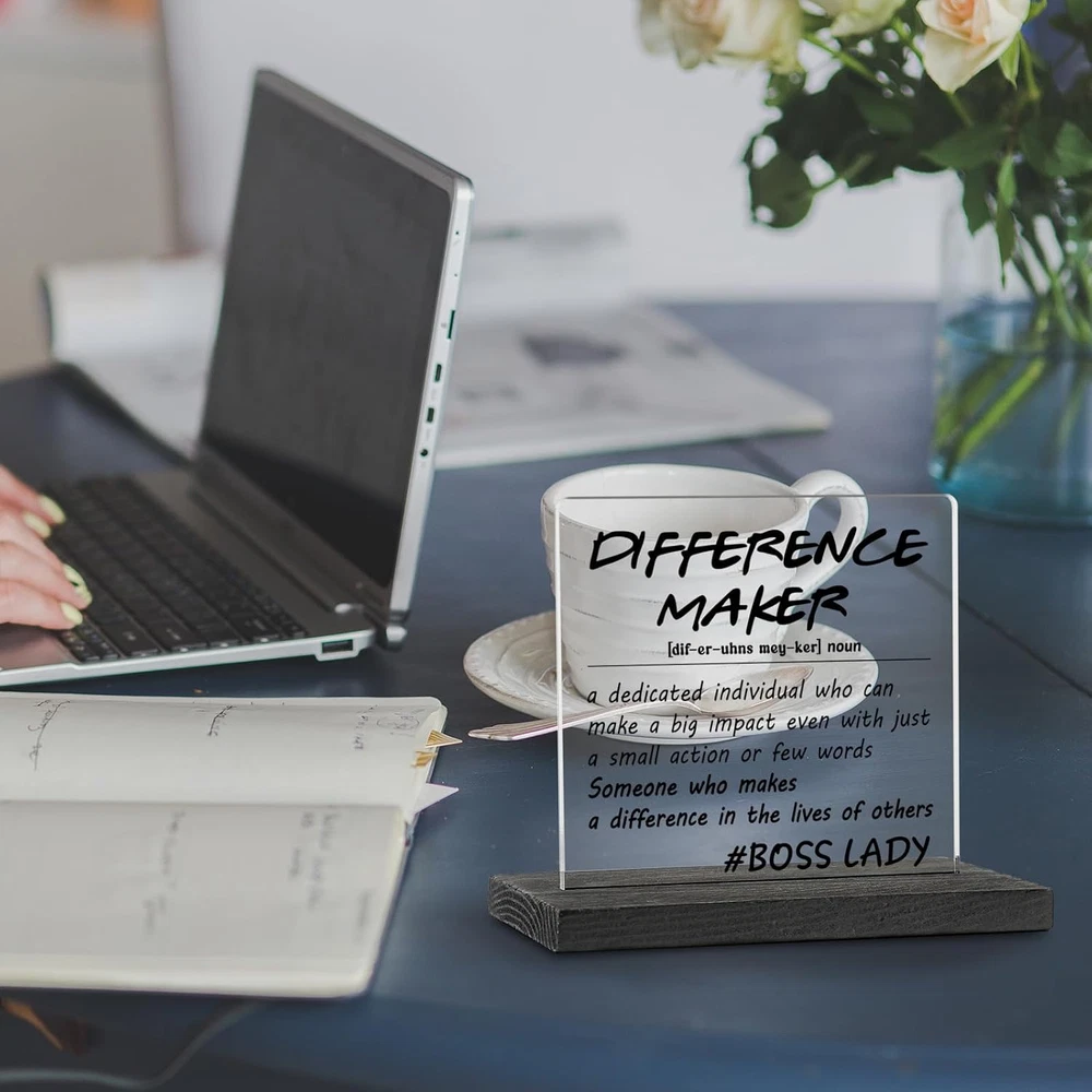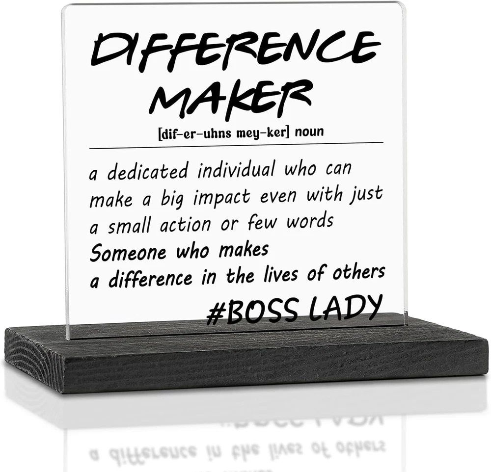 Perfect Size sign: This unique office desktop decorative sign measures approx: 4.9 x 4.2 x 0.4 inches, which is proper to be placed on the desk, easy to store and carry. Whether you're working in a corporate office or a home workspace, the hilarious office decor fits seamlessly into any setting. It's a conversation starter and a mood lifter. Perfect Decorations Gift: Difference Maker Gifts for Boss Lady Men, It Is an for Appreciation Gifts from employees colleagues to the boss lady, boss day gift, Retirement Leaving Appreciation Gift For Boss Lady Coworker, Also a funny Addition to any desk in your home or office. Office Home Decor: Break the monotony of the workday with a dash of humor. the desk plate features witty and amusing phrases that Will bring a smile to your face and your colleagues. It can also be used as a birthday gift, thanksgiving gift, new job gift, team gifts, retirement gift, boss day gift, office home table decor gift, personalize your desktop, make It unique to you or send a special message to someone. Durable and Long-lasting: The wood desk plaques are simple to assemble, Just insert the plaque signs into the slots in the base, not break or distort easily, And the surface is smooth, comfortable touching. It is printed with a beautiful clear design and funny sayings that are hard to fade, and the exquisite craftsmanship makes them to accompany you for a long time and brings you a pleasant experience of use. Free Standing Work Gifts: you can easily and quickly place them on the shelves, desks, tables, very easy to use, Takes up less space, Not only can you use it as a decoration in your office, You can also give it as a gift to others, is a great gift. Difference Maker Gifts for Boss Lady, Acrylic Decorative Signs Plaques, This is a high-definition color printing clear desk decorative sign, Black vintage wooden base and acrylic creates an exquisite tabletop decor plaque, fine workmanship, not easy to deform or break, easy to use.