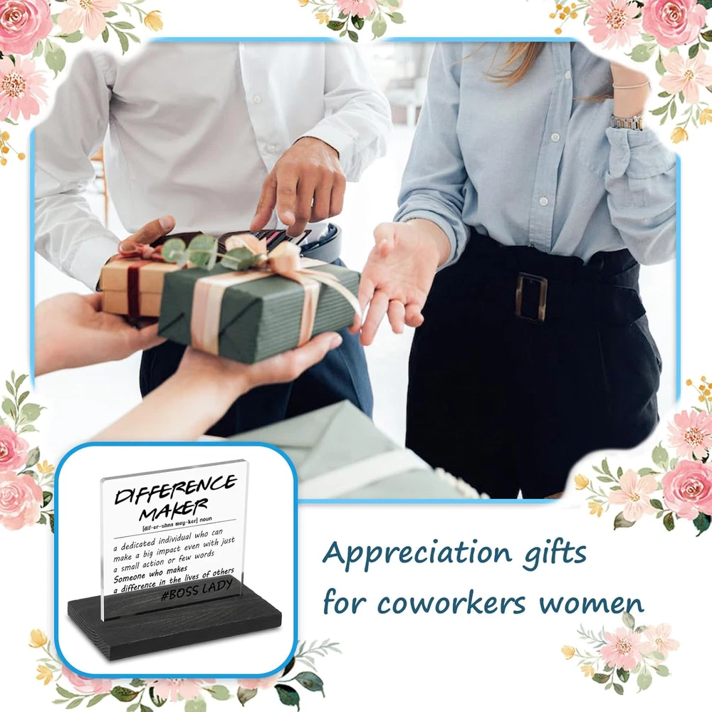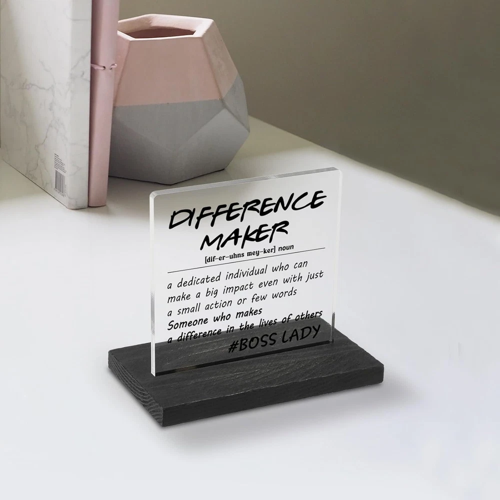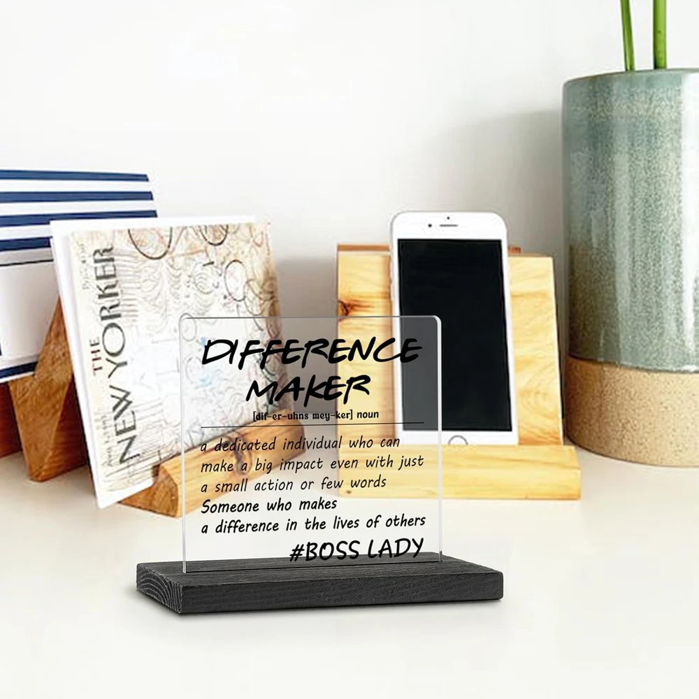 Perfect Size sign: This unique office desktop decorative sign measures approx: 4.9 x 4.2 x 0.4 inches, which is proper to be placed on the desk, easy to store and carry. Whether you're working in a corporate office or a home workspace, the hilarious office decor fits seamlessly into any setting. It's a conversation starter and a mood lifter. Perfect Decorations Gift: Difference Maker Gifts for Boss Lady Men, It Is an for Appreciation Gifts from employees colleagues to the boss lady, boss day gift, Retirement Leaving Appreciation Gift For Boss Lady Coworker, Also a funny Addition to any desk in your home or office. Office Home Decor: Break the monotony of the workday with a dash of humor. the desk plate features witty and amusing phrases that Will bring a smile to your face and your colleagues. It can also be used as a birthday gift, thanksgiving gift, new job gift, team gifts, retirement gift, boss day gift, office home table decor gift, personalize your desktop, make It unique to you or send a special message to someone. Durable and Long-lasting: The wood desk plaques are simple to assemble, Just insert the plaque signs into the slots in the base, not break or distort easily, And the surface is smooth, comfortable touching. It is printed with a beautiful clear design and funny sayings that are hard to fade, and the exquisite craftsmanship makes them to accompany you for a long time and brings you a pleasant experience of use. Free Standing Work Gifts: you can easily and quickly place them on the shelves, desks, tables, very easy to use, Takes up less space, Not only can you use it as a decoration in your office, You can also give it as a gift to others, is a great gift. Difference Maker Gifts for Boss Lady, Acrylic Decorative Signs Plaques, This is a high-definition color printing clear desk decorative sign, Black vintage wooden base and acrylic creates an exquisite tabletop decor plaque, fine workmanship, not easy to deform or break, easy to use.