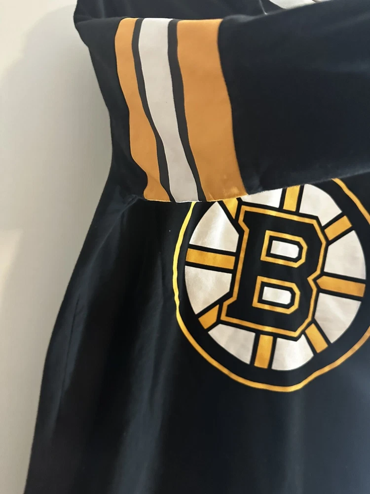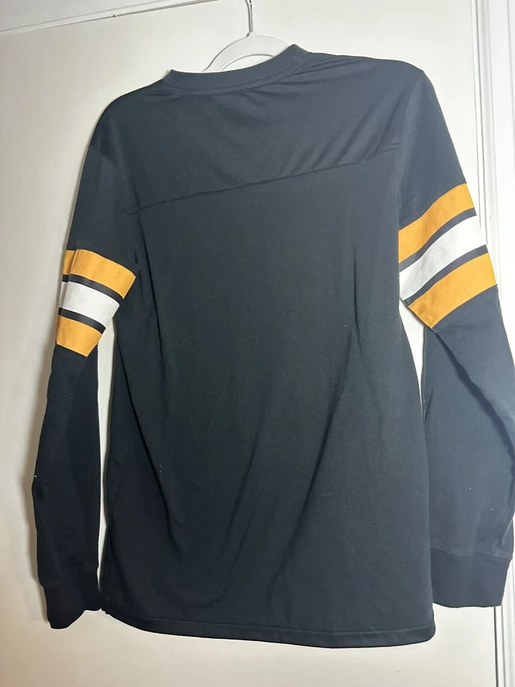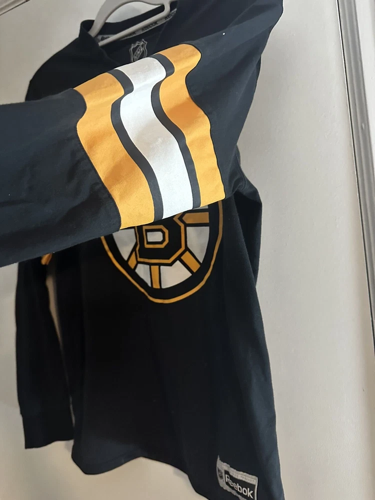 Boston Bruins Long Sleeve Shirt. Sz: Small. Black. Logo. Arm Band - yellow/black. NHL Hockey. Great condition. No Rips, stains or defects. Top or the shirt at shoulder is more of a traditional jersey fabric. The bottom of the shirt is traditional cotton tight knit. Please see measurements for sizing. 17” wide - pit to pit. Laying flat 28” long top to bottom - laying flat 24” sleeve - from shoulder cut