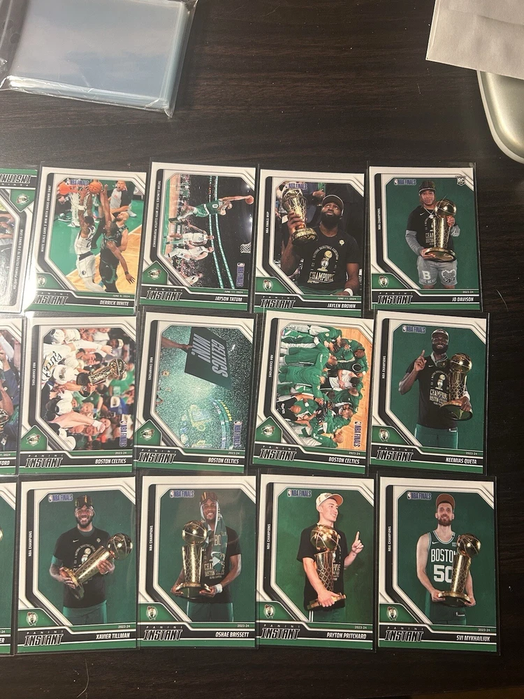 Boston Celtics 2023-24 Panini Instant NBA Finals Lot Of 21 Cards. Missing Jordan Walsh RC, Kristaps Porzingis base card, Kristaps Porzingis returns, Joe Mazzula base, Luke Kortnet base, Celtics logo Pritchard have court Jaylen brown dunk and drew Peterson RC. See photos. Feel free to send me an offer. Some cards have some corner damage