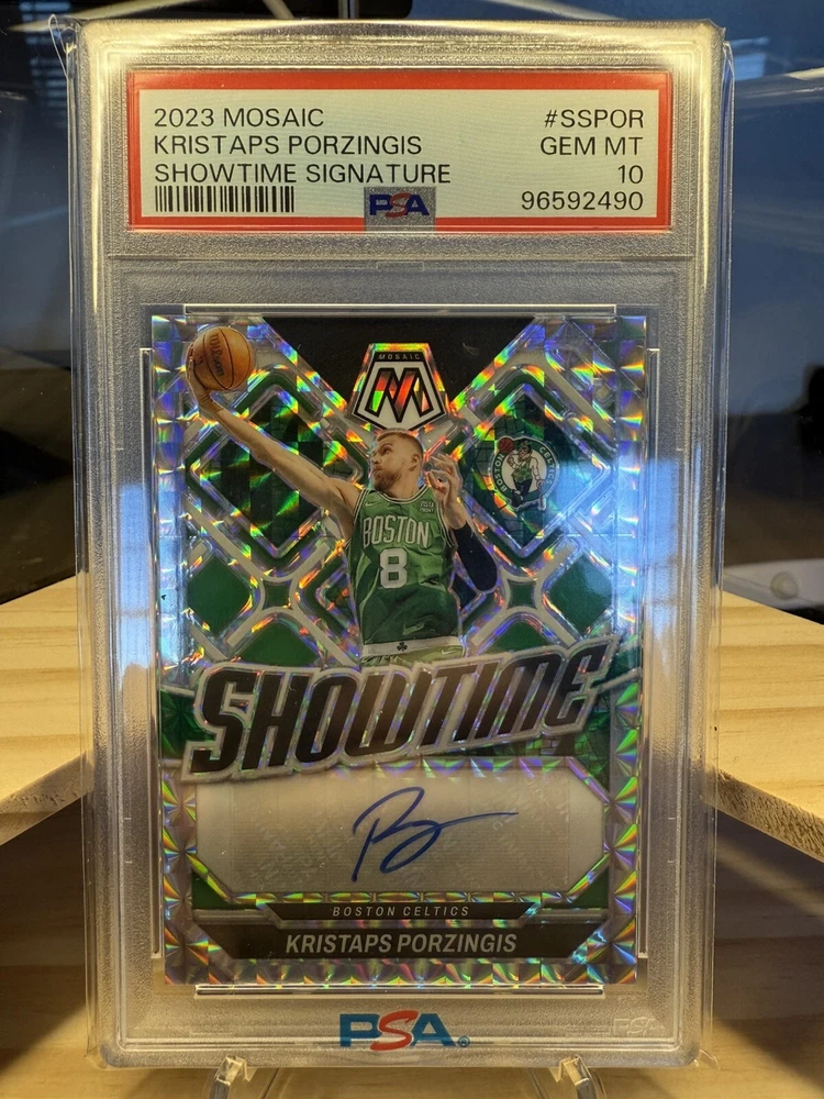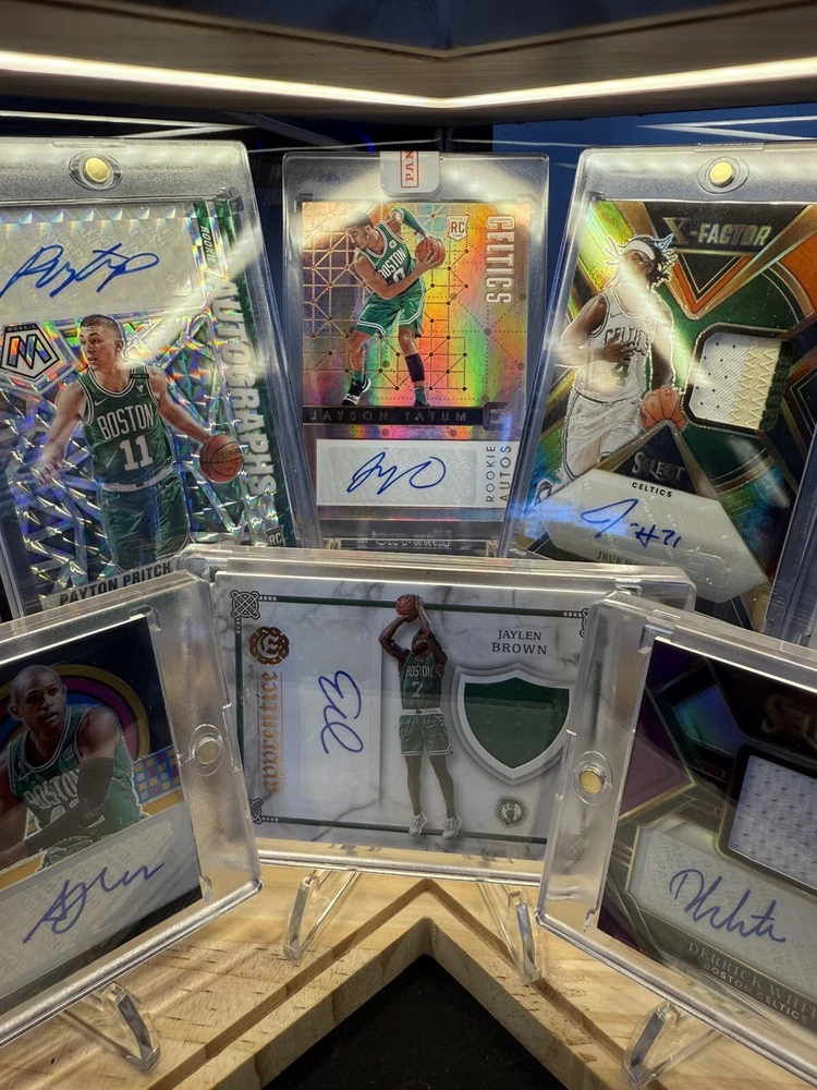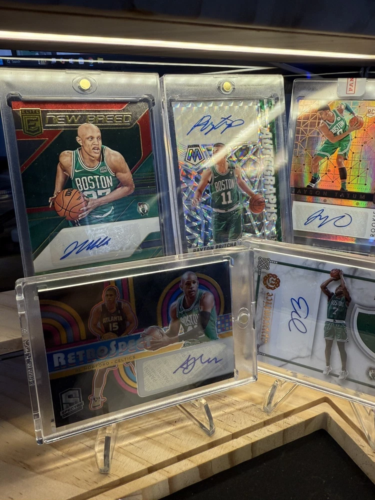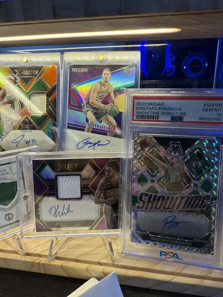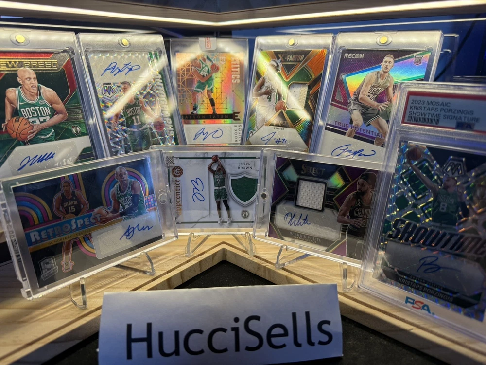 Kick off your collection with an almost complete set of autograph cards from the championship Boston Celtics team! Including various rookie cards, patch autos, rpa, sealed and/or graded! Great assortment of cards in amazing condition. You will be receiving 9 cards in total. Please see details below for each card. Jayson Tatum 2017 -18 Panini Essentials Card No. 223 Rookie Autos Still factory sealed by Panini Jaylen Brown 2016 -17 Panini Excalibur Card No. 2 Apprentice Rookie Patch Auto (RPA) - player worn patch Jrue Holiday 2023 -24 Panini Select Numbered: 23 /25 Card No. XFS-HOL X-Factor - Color Blast Prizm Auto/ Tri Color Patch - game-worn/used material Derrick White 2022 -23 Panini Select Numbered: 56 /99 Card No. AM-DKW Purple Prizm Patch Auto - game-worn/used material Kristaps Porzingis 2023 -24 Panini Mosaic PSA 10 GEM MT PSA# 96592490 Card No. SS-POR Showtime Signature Al Horford 2023 -24 Panini Spectra Numbered: 07 /99 Card No. RSA-ALH Retrospect Prizm Autograph Payton Pritchard 2020 -21 Panini Mosaic Card No. RA-PPR Prizm Rookie Autographs Sam Hauser 2021 -22 Panini Recon Card No. TPS-SAM True Potential Rookie Auto Jordan Walsh 2023 -24 Panini Donruss Elite Card No. NB-JWB New Breed Rookie Auto Will be safely shipped in an USPS Priority Mail Small Box. Thanks for looking, Cheers!