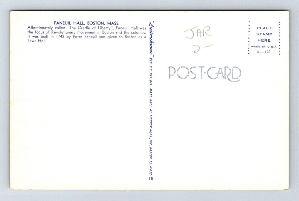 Boston Massachusetts Faneuil Hall Historic Landmark Chrome UNP Postcard You will receive the exact postcard in the picture. We use a high quality scanner to capture pictures of the front and back for every postcard we have listed. Postcards will be in the condition as shown in the pictures. We ship Mon-Fri. We also offer combined shipping discounts or free shipping. If we have shipping on your listing you can buy as many additional postcards as you want and they will ship for free after the fist postage is paid. If you select first class shipping and pay the extra your postcard will be shipping as a package with extra protection. If you choose free shipping or $1.50 shipping your postcard will be shipped in a standard envelope with soft plastic sleeve and do not bend written on the envelope. Orders of 15 or more cards or with single cards over $20 in them will automatically be upgraded to first class and at least a photo mailer. If you have any questions feel free to ask. We are willing to consider reasonable offers and we offer discounts on orders of more than one card. Thank You _gsrx_vers_1436 (GS 9.0.5 (1436)) _gsrx_vers_1608 (GS 9.5 (1608)) _gsrx_vers_1653 (GS 9.7.5 (1653))