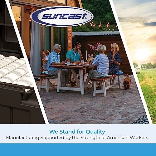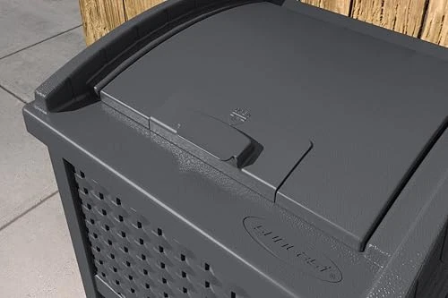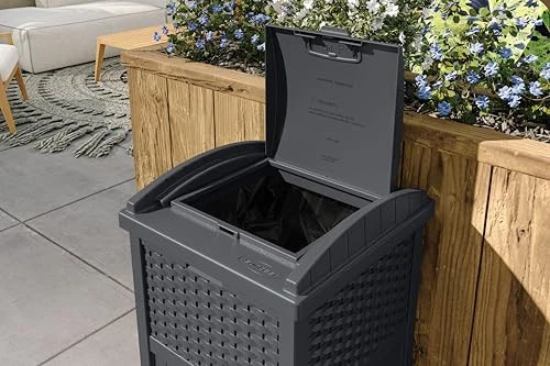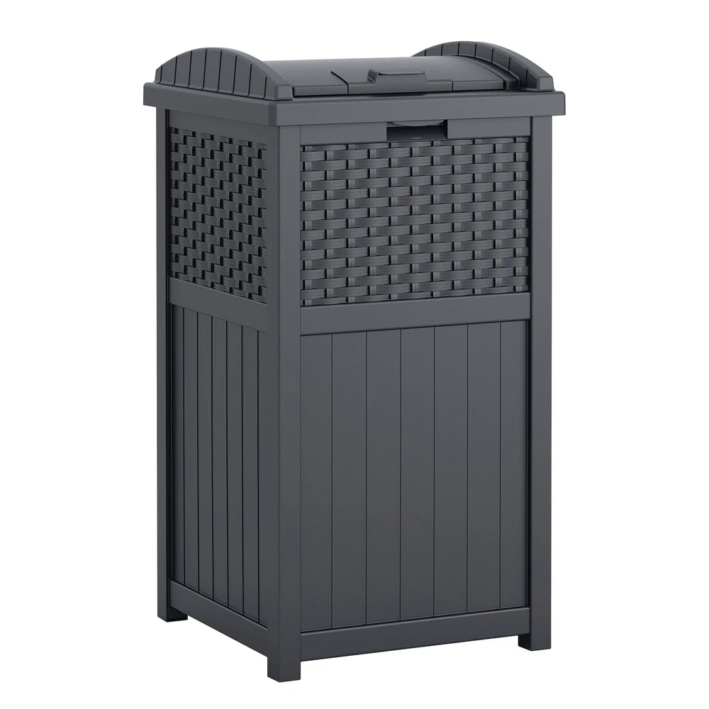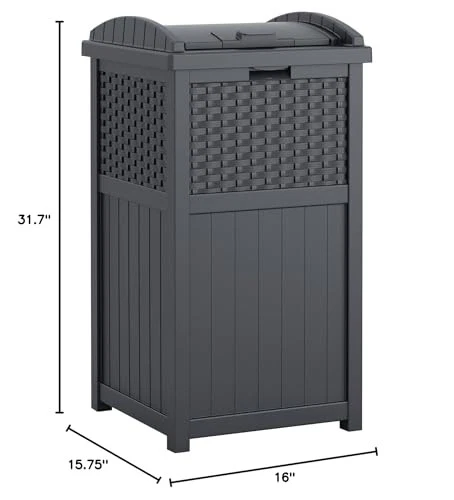 Elevate your outdoor space while maintaining cleanliness with the Suncast 33 Outdoor Wicker Trash Can for Patio. Featuring a decorative wicker-style design, this porch trash can blends seamlessly into any patio, deck, or garden area, offering an attractive solution for waste management. Its 33-gallon capacity works with standard 30-gallon garbage bags, ensuring convenient and hassle-free usage. The hinged lid with a secure latch keeps garbage contained and deters pests, while its durable, weather-resistant resin construction provides protection against fading, cracking, and water damage. Measuring 16" W x 15.75" D x 31.7" H, this compact trash can delivers substantial storage without taking up too much space, making it an ideal addition to any outdoor setting. OUTDOOR PATIO TRASH CAN: Features a decorative wicker-inspired design that complements any outdoor setting, including patios, decks, and gardens, while effectively concealing waste HINGED LID WITH LATCH: The functional lid design provides easy access for garbage disposal and ensures it stays securely closed to keep contents out of sight and protect against pests and wind 30-GALLON CAPACITY: Accommodates standard 30-gallon garbage bags, making it simple to replace and maintain without the need for custom liners WEATHER-PROOF: Made from durable, weather-resistant resin that resists cracking, fading, and water damage, providing reliable use through all seasons and maintaining its attractive appearance SPACE-EFFICIENT DESIGN: Compact dimensions of 16" W x 15.75" D x 31.7" H offer generous 33-gallon capacity while minimizing the footprint, ideal for smaller outdoor spaces or high-traffic areas