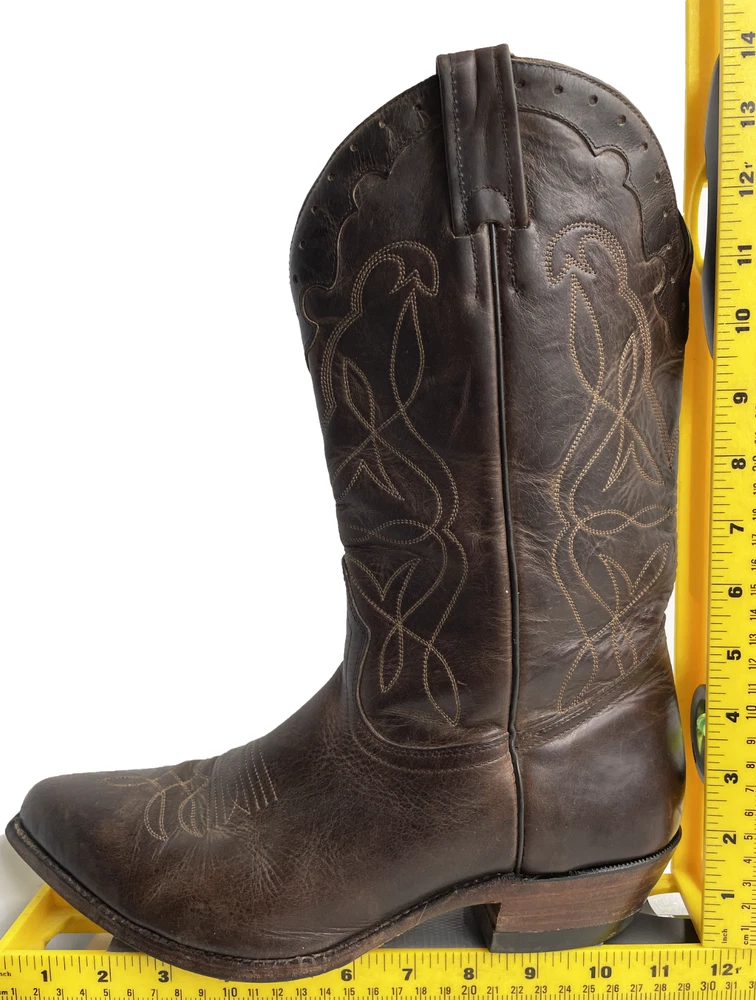 US Shoe Size: 9 Color: Brown Closure: Pull On Model: Boulet Shoe Width: EE Style: Western Toe Shape: Pointed Toe Department: Men Theme: Biker, Cowboy, Western Pattern: Western Type: Boot Accents: Embroidered Upper Material: Leather Features: Comfort Brand: Boulet
