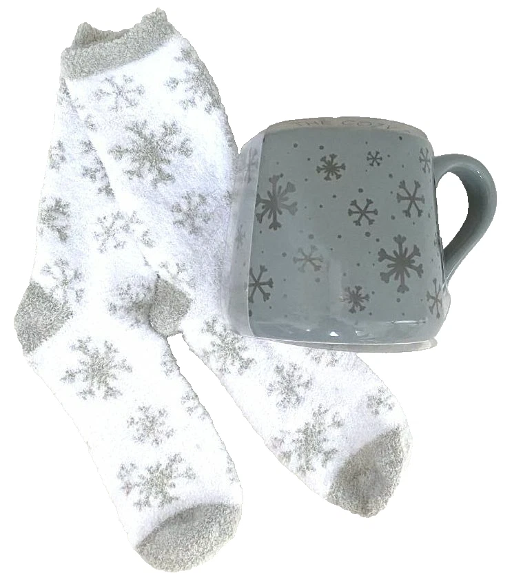 NEW WITH TAGS Boutique gray glossy ceramic silver snowflake coffee mug and white and gray snowflake print socks. Ultra soft and fluffy socks to keep you warm while drinking your tea, cocoa or coffee. Makes a great gift. Inv: 729103-05