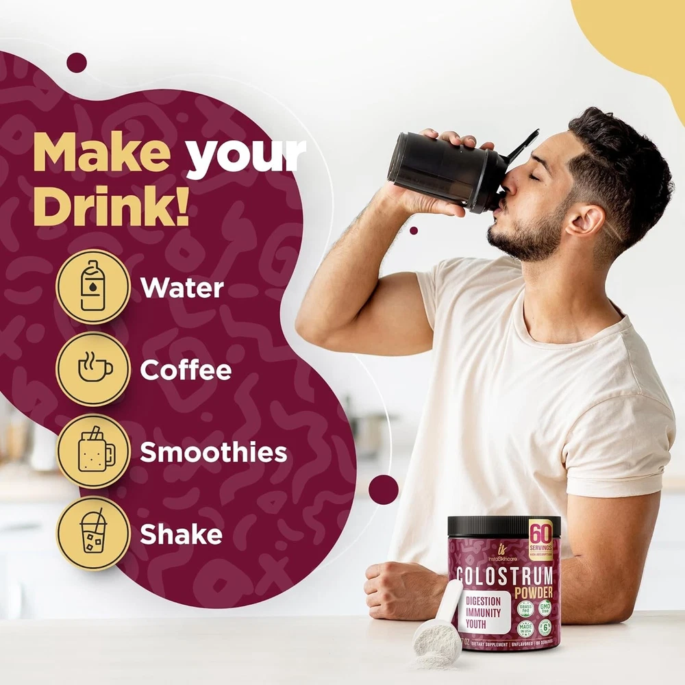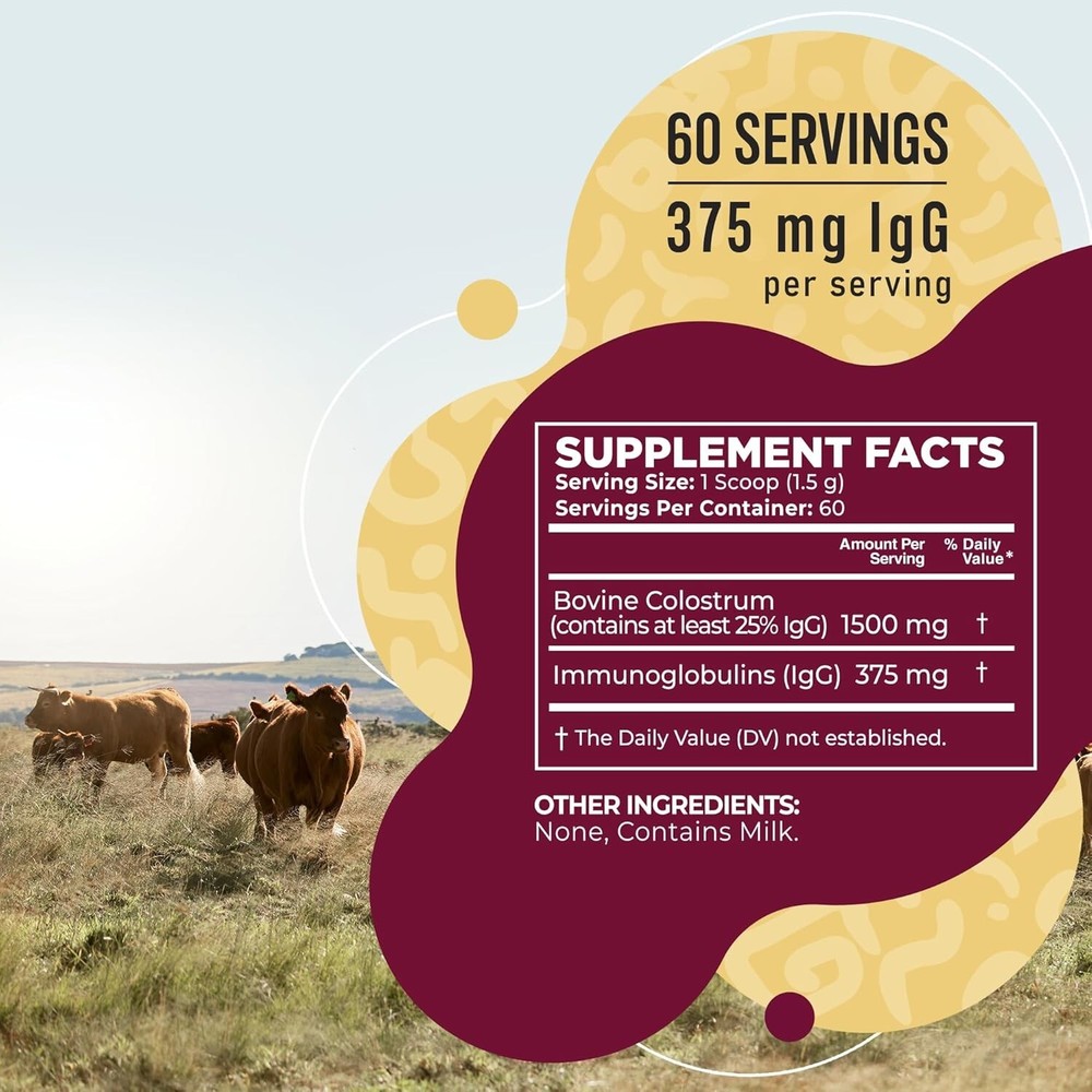 Bovine Colostrum Powder Highly Concentrated Pure Bovine 3.17 oz NEW. ORIGINAL DEFENSE BOOSTER - Colostrum is nature's original defense booster, containing high levels of antibodies and immunoglobulins. Regular consumption of our Colostrum Powder can provide valuable support to your body's defenses, helping you stay healthy and resilient year-round. GRASS-FED COWS - Sourced from pasture-raised, grass-fed cows, our Bovine Colostrum ensures a premium quality product. The natural and nutrient-rich diet of these cows contributes to a higher quality colostrum, free from synthetic additives and antibiotics. MIRACLE IN THE JAR - Our Bovine Colostrum is unflavored, allowing for easy integration into your daily routine. Whether mixed with a beverage or added to recipes, the unflavored nature ensures flexibility in consumption, catering to various preferences. OPTIMAL BIOAVAILABILITY - Our Bovine Colostrum is carefully processed to maintain optimal bioavailability. This means that the valuable nutrients are preserved in their natural state, allowing for maximum absorption and utilization by the body. ENHANCED DISSOLUTION WITH MIXER - Optimize the dissolution of Bovine Colostrum Powder by using a mixer. Incorporating a mixer ensures thorough blending, allowing the powder to dissolve completely and evenly into your chosen liquid, maximizing its effectiveness for consumption.