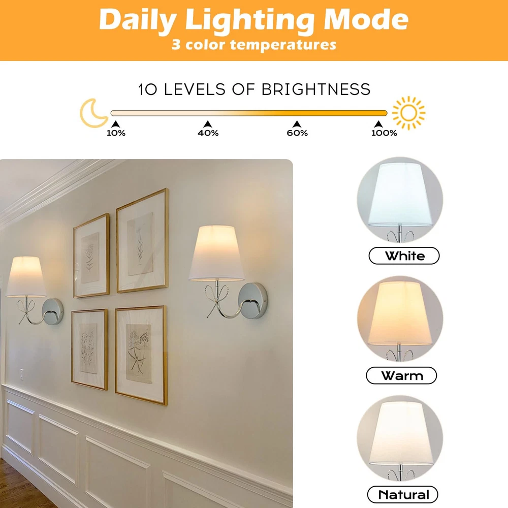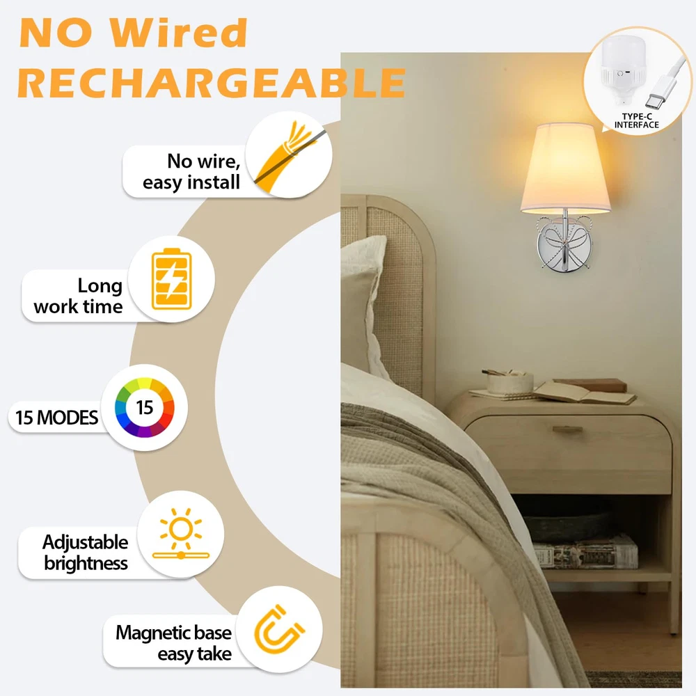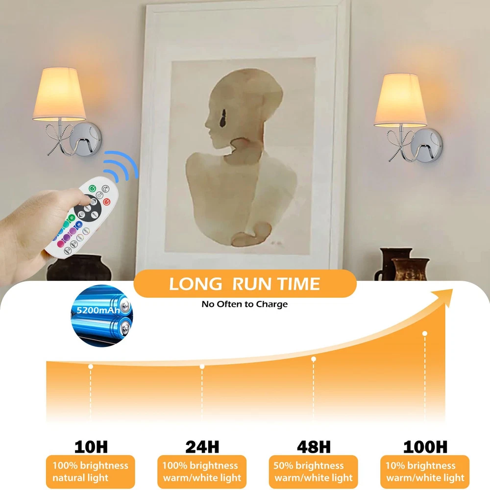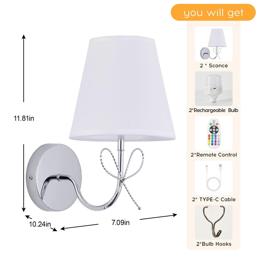 Wireless Wall Sconces Set of Two – Easy Installation & Rechargeable Convenience Transform your space with these battery-operated wall sconces, featuring 320-lumen 5200mAh rechargeable bulbs. Enjoy 20 hours of high brightness or up to 100 hours on the lowest setting with a full charge. These cordless wall lights are designed for easy installation without wiring, making them perfect for renters and homeowners alike. Their sleek, modern design seamlessly blends into any bedroom, living room, hallway, or indoor decor setup Wireless Wall Sconces Set of Two – Easy Installation & Rechargeable Convenience Transform your space with these battery operated wall sconces, featuring 320-lumen 5200mAh rechargeable bulbs. Enjoy 20 hours of high brightness or up to 100 hours on the lowest setting with a full charge. These cordless scomce wall lighting are designed for easy installation without wiring, making them perfect for renters and homeowners alike. Their sleek, modern Customizable Lighting with Adjustable Brightness & RGB Colors Create the perfect ambiance with 3 color temperatures (3000K, 4000K, 6000K) and 10 brightness levels ranging from 10% to 100%. These dimmable sconces also offer 12 vibrant RGB colors, allowing you to switch between warm, cozy lighting and colorful, dynamic effects. Ideal for modern wall decor and versatile for any mood or occasion Smart Timer & Memory Functions for Convenience Set the integrated timer to automatically turn off the lights after 30 minutes or 1 hour, preserving battery life and saving energy. The built-in memory function remembers your last settings for brightness and color, eliminating the need for constant reconfiguration Remote-Controlled for Ultimate Ease These rechargeable wall sconces include a remote control, enabling you to adjust brightness, colors, and timer settings effortlessly. Whether you're relaxing in bed or hosting a cozy evening, these cordless lighting fixtures provide ultimate convenience with just a press of a button Elegant Design for Any Indoor Space Featuring a gold-finished lamp frame and white fabric shade, these decorative wall sconce combine sophistication with practicality. Made with high-quality metal and impeccable craftsmanship, they’re perfect for enhancing the decor of your bedroom, hallway, entryway, kitchen, or living room. Designed for modern, vintage, or classic interiors, these wall-mounted lights bring both style and functionality to your home Reliable After-Sales Support & 1-Year Warranty We stand behind the quality of our wall sconces with a 1-year warranty for added peace of mind. If you encounter any issues or need assistance, our dedicated support team is here to help. Simply reach out, and we’ll ensure your concerns are resolved quickly and efficiently
