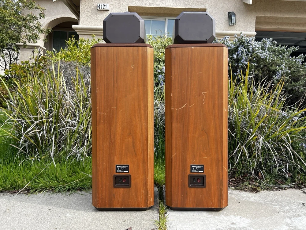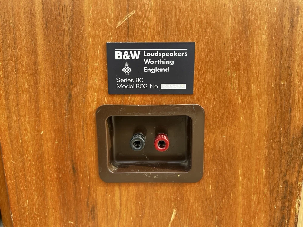 For Sale: Bowers & Wilkins B&W Series 80 Model 802 Speakers These classic speakers are in very good Working condition Specifications: Frequency Response: 55Hz to 20 kHz +- 2dB Low Frequency System: Closed box acoustic suspension with system resonance of 49Hz Dispersion: Vertical: ± 1dB over 10 degrees of center window Horizontal: +0, -3dB over 60 degrees of center window, 20Hz to 13kHz Drive Units: Vertical in-line configuration corrected for minimum inter-unit time delay Computer matched in pairs ensuring accuracy typically better than 0.25dB Bass Drivers (2): Diaphragm: 6.5” Thermos plastic cone with PVA compound coating Ultra long throw suspension Voice Coil: 38mm D high temperature Nomex Magnet System: 2.25kg, ceramic Midrange Driver: Diaphragm: 4” D aromatic polyamide fiber matrix cone, critically formed and PVA impregnated following a laser interferometry computer-linked pattern Voice Coil: 25mm phenolic bonded and aluminum lined Magnet System: Ceramic High-Frequency Driver: Diaphragm: 1” multi filament polyester weave dome, mechanically dampened Voice Coil: 1” high temperatures epoxy impregnated Magnet System: High energy nickel cobalt, center pole Impedance: 8 ohms nominal throughout entire operating range Sensitivity: 1W into 8 ohm load for a spl of 85dB at 1m, sinewave input at 300Hz Power Limit: Minimum 80W into 8 ohms No upper limit because of overload protection device Dimensions: Height 41" x Width 11 ¾ ” x Depth 14 ½ ” Weight: 72 lbs