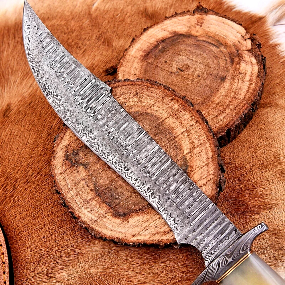 CUSTOM HAND MADE HAND FORGED DAMASCUS STEEL BOWIE HUNTING KNIFE SURVIVAL CAMPING HIKING BUSHCRAFT CAMEL BONE & WOOD WITH DAMASCUS STEEL GUARD HANDLE This superb design knife is hand forged. Blade of this knife has a nice file work and is made of 512 layers of 4340 stainless steel and 1075 high carbon steel and hardness 55-58 HRC . This robust knife is lab tested under intense conditions, the balance and shape of this knife ensures perfect grip. Overall Length: 15" Inches Blade Length: 10" Inches Handle Length: 5" Inches Damascus Design: Ladder Pattern Layers: 512 Package Includes: with Sheath Care Instructions: Keep the knife dry after each cleaning. Warning: Keep fingers clear of blades. Store away from children.