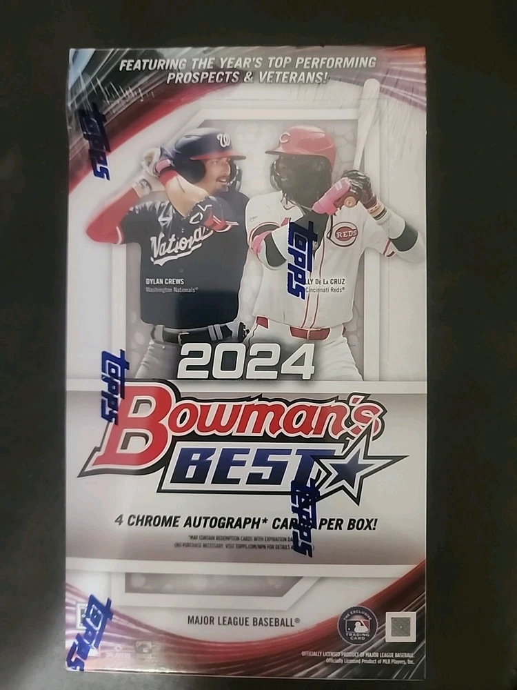 Bowman Best 2024 4 Chrome Autograph Sealed 2024 Bowman's Best Baseball Hobby Box 2024 Bowman& Configuration: 12 packs per box. 5 cards per pack. PRODUCT HIGHLIGHTS - Only the best make the cut in this year’s Bowman’s Best release, spotlighting the game’s top performers. - Collect the entire 100-card Base Set featuring the BEST superstars, rookies, and prospects from around baseball. Box Break: - 4 Chrome Autographs - 12 Base Card Refractor Parallels PRODUCT DESCRIPTION BASE CARDS Parallels - Refractor Parallel – 1 Per Pack - Wave Refractor Parallel – 1:12 Packs - Mini-Diamond Refractor Parallel - #’d to 299 - Purple Refractor Parallel - #’d to 250 - Purple Mojo Parallel - #’d to 250 NEW! - Aqua Lava Refractor Parallel - #’d to 199 - Blue Refractor Parallel - #’d to 150 - Blue X-Fractor Parallel - #’d to 150 NEW! - Green Refractor Parallel - #’d to 99 - Green Mini-Diamond Refractor Parallel - #’d to 99 - Yellow Lazer Refractor Parallel - #’d to 75 NEW! - Gold Lava Refractor Parallel - #’d to 50 - Gold Refractor Parallel - #’d to 50 - Orange Refractor Parallel - #’d to 25 - Black Refractor Parallel - #’d to 10 NEW! - Red Refractor Parallel - #’d to 5 - Red Lava Refractor Parallel - #’d to 5 - SuperFractor Parallel - #’d 1-of-1 INSERT CARDS 1955 Bowman Anime – Limited NEW! - Black Refractor Parallel – #’d to 10 - Red Refractor Parallel - #’d to 5 - SuperFractor Parallel - #’d 1-of-1 2024 MLB All-Star Futures Game – (1:30 Packs) NEW! - Lava Refractor Parallel - #’d to 50 - SuperFractor Parallel - #’d 1-of-1 Strokes of Gold – (1:288 Packs) NEW! Fabled Phenoms – (1:6 Packs) NEW! - Mini-Diamond Refractor Parallel – Limited - Lava Refractor Parallel - #’d to 50 - SuperFractor Parallel - #’d 1-of-1 Impact Players – (1:12 Packs) NEW! - Mini-Diamond Refractor Parallel – Limited - Lava Refractor Parallel - #’d to 50 - SuperFractor Parallel - #’d 1-of-1 Best Ballers – (1:6 Packs) NEW! - Mini-Diamond Refractor Parallel – Limited - Lava Refractor Parallel - #’d to 50 - SuperFractor Parallel - #’d 1-of-1 Bowman Showpieces – (1:18 Packs) NEW! - Mini-Diamond Refractor Parallel – Limited - Lava Refractor Parallel - #’d to 50 - SuperFractor Parallel - #’d 1-of-1 AUTOGRAPHS Best of 2024 Autographs - Refractor Parallel - Blue Refractor Parallel - #’d to 150 - Green Refractor Parallel - #’d to 99 - Gold Mini-Diamond Refractor Parallel - #’d to 50 NEW! - Gold Refractor Parallel - #’d to 50 - Orange X-Fractor Parallel - #’d to 25 NEW! - Orange Refractor Parallel - #’d to 25 NEW! - Teal Refractor Parallel - #’d to 15 NEW! - Black Refractor Parallel - #’d to 10 NEW! - Red Refractor Parallel - #’d to 5 - Red Lava Refractor Parallel - #’d to 5 - SuperFractor Parallel - #’d 1-of-1 - Printing Plates - #’d 1-fo-1 Dual Autographs – #’d to 75 - Gold Refractor Parallel - #’d to 50 NEW! - Orange Refractor Parallel - #’d to 25 NEW! - Red Refractor Parallel - #’d to 5 NEW! - SuperFractor Parallel - #’d 1-of-1 Triple Autographs – #’d to 75 NEW! - Gold Refractor Parallel - #’d to 50 NEW! - Orange Refractor Parallel - #’d to 25 NEW! - Red Refractor Parallel - #’d to 5 NEW! - SuperFractor Parallel - #’d 1-of-1 Quad Autographs – #’d to 75 NEW! - Lava Refractor Parallel - #’d to 50 - Mini-Diamond Refractor Parallel - #’d to 25 - SuperFractor Parallel - #’d 1-of-1 Family Tree Dual Autographs – Varied #ing - Mini-Diamond Refractor Parallel - #’d to 10 - SuperFractor Parallel - #’d 1-of-1 Family Tree Triple Autographs – Varied #ing - Mini-Diamond Refractor Parallel - #’d to 10 - SuperFractor Parallel - #’d 1-of-1 Impact Players Autographs – Varied #ing NEW! - Lava Refractor Parallel - #’d to 50 - Mini-Diamond Refractor Parallel - #’d to 25 - SuperFractor Parallel - #’d 1-of-1 Best Ballers Autographs – Varied #ing NEW! - Lava Refractor Parallel - #’d to 50 - Mini-Diamond Refractor Parallel - #’d to 25 - SuperFractor Parallel - #’d 1-of-1 Fabled Phenoms Autographs – #’d to 99 NEW! - SuperFractor Parallel - #’d 1-of-1 Bowman Showpieces Autographs – #’d to 99 - SuperFractor Parallel - #’d 1-of-1 2024 MLB All-Star Futures Game Autograph Relics – Varied #ing NEW! - Purple Refractor Parallel - #’d to 250 - Blue Refractor Parallel - #’d to 150 - Green Refractor Parallel - #’d to 99 - Gold Refractor Parallel - #’d to 50 - Orange Refractor Parallel - #’d to 25 NEW! - Black Refractor Parallel - #’d to 10 NEW! - Red Refractor Parallel - #’d to 5 - SuperFractor Parallel - #’d 1-of-1