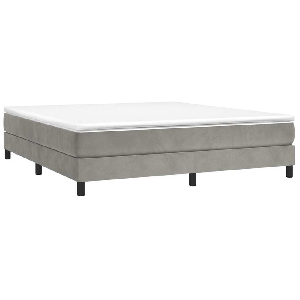 Size: California king Get a better restful night's sleep from this box spring bed frame! It makes a welcoming addition to any bedroom. Soft velvet: Velvet is a soft, luxurious fabric that is recognized by its dense pile of evenly cut fibers that have a smooth nap. Velvet fabric features a distinctive soft feel, making it comfortable to touch. Supportive legs: The bed is supported by sturdy legs, which ensure its stability, safety and firmness. Plywood slats: The plywood slats provide good weight distribution, ensuring that the mattress stays in place with every twist and turn of your body during sleep. Good to know: A mattress is not included with this bed. We do offer a various selection of mattresses. You can check our shop for a matching mattress. Color: Light gray Material: Velvet (100% polyester), plywood, engineered wood Overall dimensions: 85" x 72" x 9.8" (L x W x H) Suitable mattress size: 72" x 83.9" (W x L) California King (mattress not included) California Proposition 65