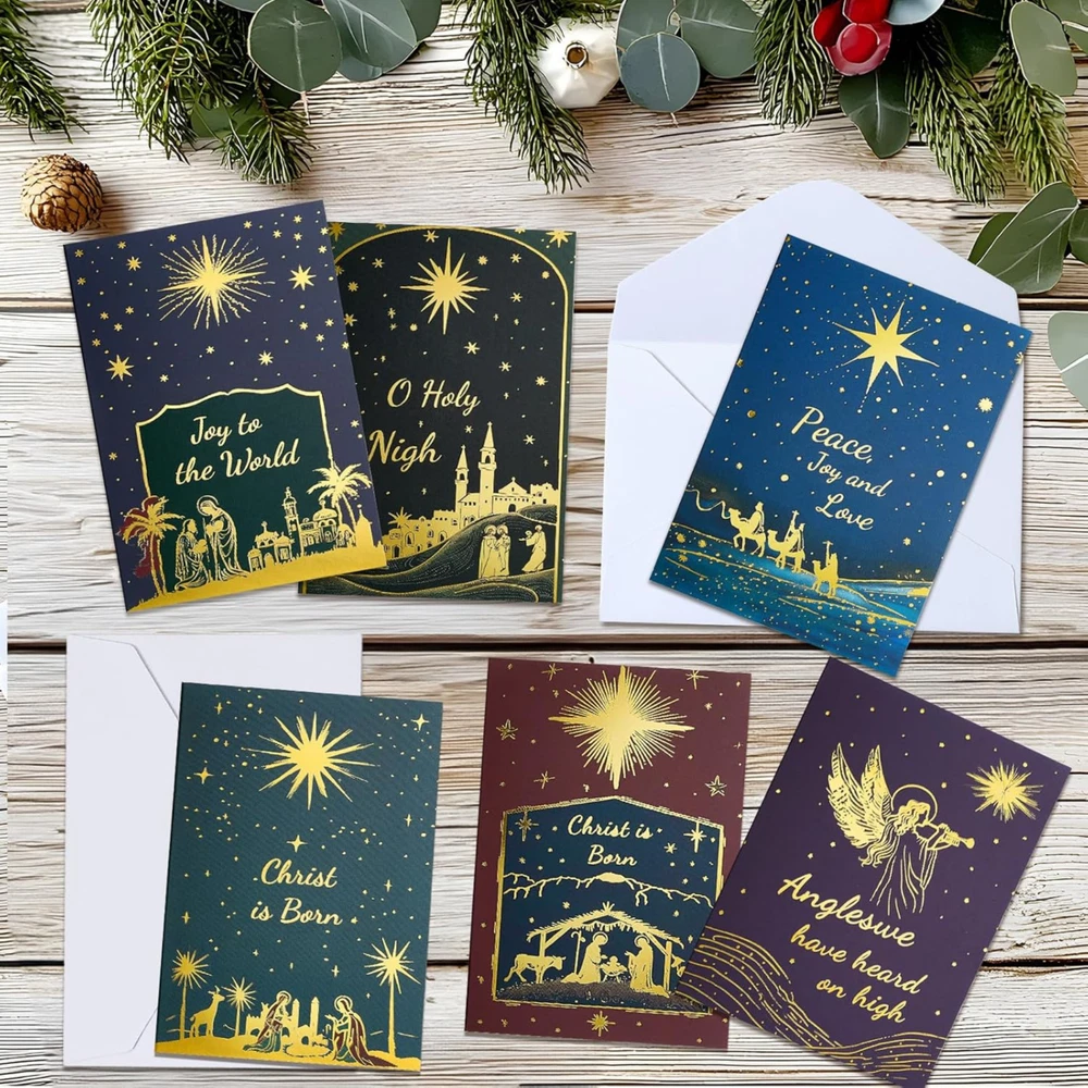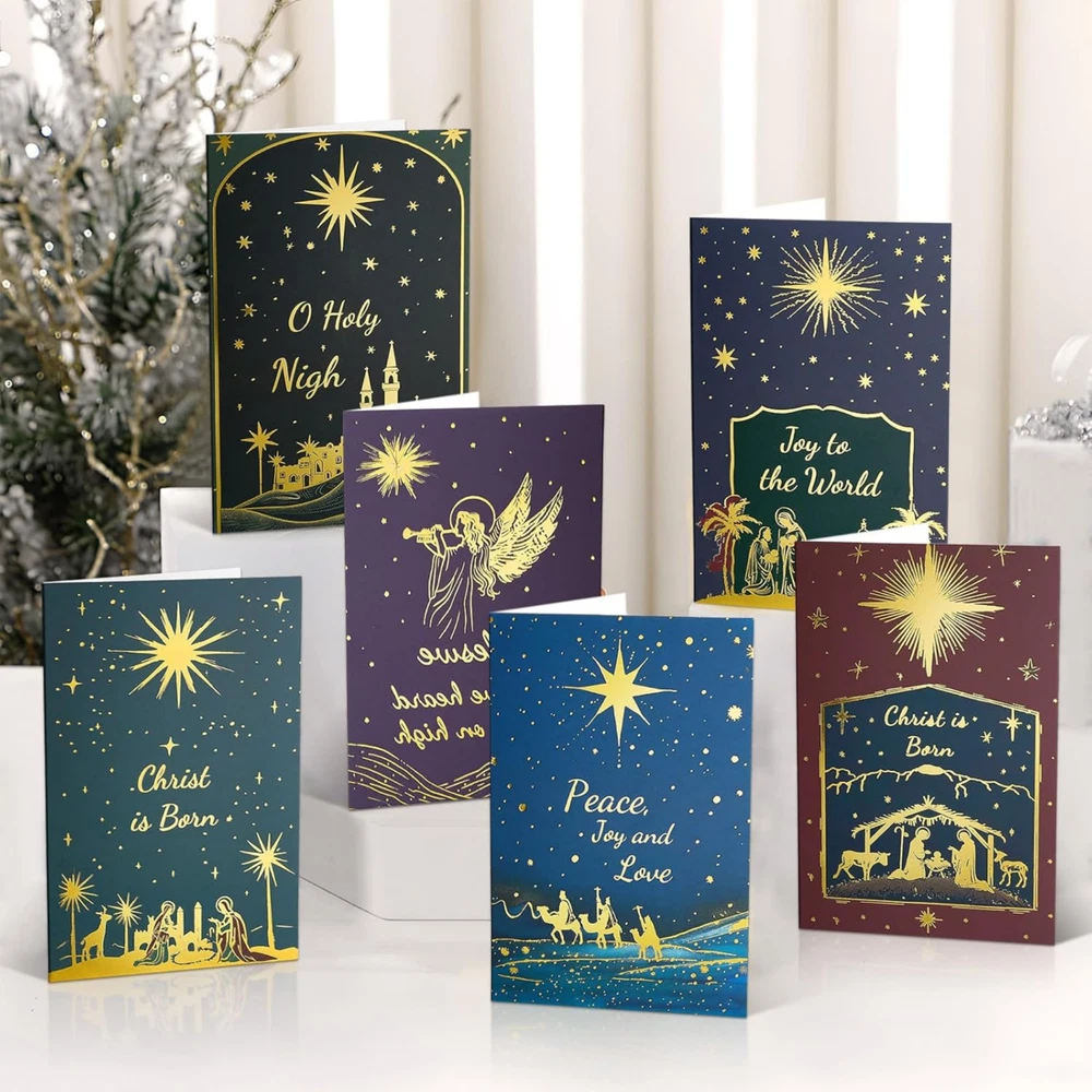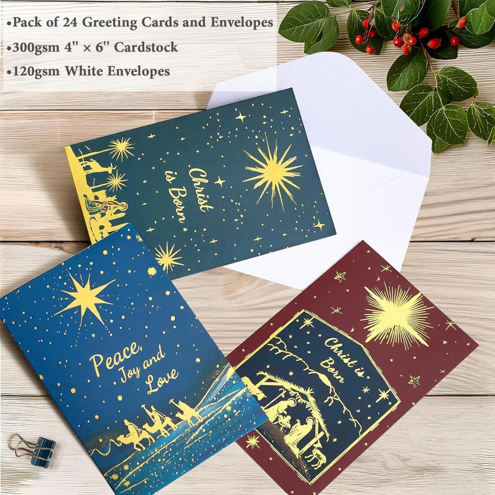 Boxed Religious Christmas Cards with Envelopes - Blank Inside Christian Christmas Cards with White Envelopes, Assorted Nativity Christmas Cards Bulk (24-Pack, 4" x 6") BOXED RELIGIOUS CHRISTMAS CARDS WITH ENVELOPES: Celebrate the reason for the season with our 24-pack of 4" x 6" christian Christmas cards, adorned with 6 distinct Christian designs in full gold foil. Each set is accompanied by 24 premium white envelopes and 24 elegant stickers, ensuring your messages of faith and joy are delivered with a personal touch. ASSORTED RELIGIOUS DESIGNS FOR INSPIRATION: This variety pack includes 6 different Christian-themed designs, each featuring beautiful gold foil accents that highlight the sacredness of the holiday. These cards are perfect for sending to family, friends, and church members, offering a meaningful way to connect during the Christmas season. BLANK INSIDE FOR CUSTOM MESSAGES: Craft your own heartfelt message inside each card, as they are blank for your convenience. A tasteful pattern in the right bottom corner of every card adds a refined touch, allowing you to share your blessings and warm wishes in your own words. PREMIUM QUALITY WITH GOLD FOIL DETAILING: Crafted from durable 300gsm cardstock with exquisite gold foil designs, these boxed Christmas cards with envelopes exude elegance. The 120gsm white envelopes match the cards' high quality, ensuring they arrive in perfect condition to convey your spiritual sentiments. CONVENIENT AND ECO-FRIENDLY PACKAGING: Packaged in an eco-friendly box for easy storage and protection, this set of Christmas cards is designed to be as kind to the environment as it is to your holiday correspondence. Spread the joy of the season with these delightful cards that are sure to bring smiles to faces and warmth to hearts. Product Description