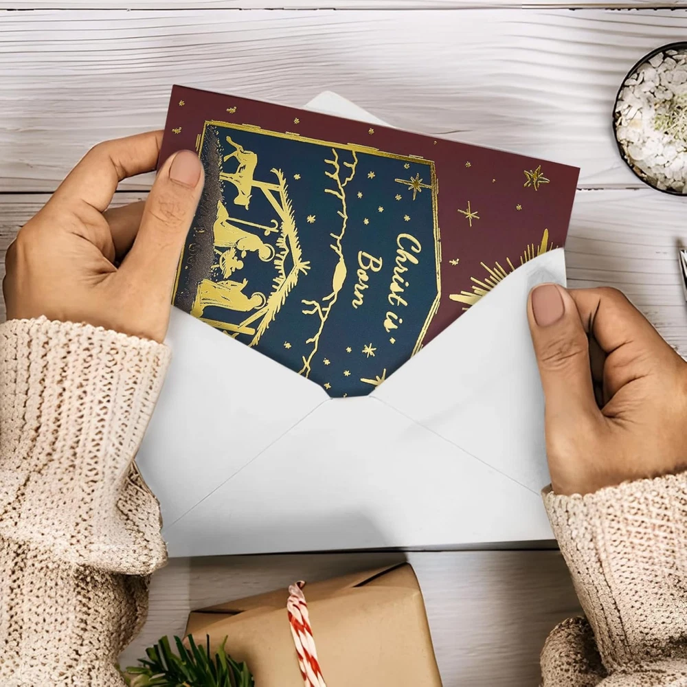 What is in the box?: Envelopes, Stickers Number of Pattern: 6 Theme: Christian Type: Envelopes Style: Religious Occasion: Christmas, Holiday, New Year Color: ‎Multiple Colors with ‎Gold Foil Icons Product Dimensions: ‎6 x 4 x 0.04 inches Item Weight: ‎12.3 ounces Pack: 24 With Envelopes and Stickers?: Yes Envelope Color: White Number of Items: 24