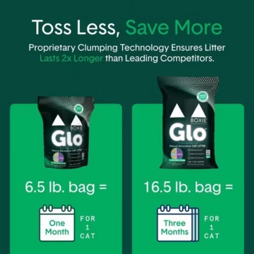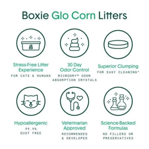 Important Note for Our Valued Customers: To offer you the best prices with free shipping, we occasionally experience shipping delays. If this happens, we’ll notify you immediately, issue a full refund, and invite you to place a new order at your convenience. To keep costs low, we sometimes reuse branded packaging boxes for shipments—we appreciate your understanding if you receive your order in repurposed packaging. Rest assured, all products we sell are 100% brand new, unopened, and freshly manufactured, including pet food and human-grade items, with a minimum 8-month shelf life remaining. If any issues arise, please contact us first—we’re committed to resolving them quickly. If you’re not completely satisfied, we offer a full refund with no hassle. Thank you for your trust and support! Highlights 30-day odor control with plant-based clumping 3x stronger clumps for superior odor control Glo™ light attractant guides cats and kittens to the litter box Prevents litter box issues and behavioral problems Eco-friendly, lightweight corn granules, 60% lighter Easy handling for cats and owners alike Supports FLUTD prevention and reduces litter box stress Multi-sensory system with sight, smell, and touch attractants Description Boxie® Glo™ Clumping Corn Cat and Kitty Litter is crafted for your cat’s health and your home’s cleanliness. This eco-friendly, plant-based formula offers superior odor control for up to 30 days while forming strong, tight clumps that make scooping quick and easy. With Proactive Glo™ Light Attractant technology, UV-visible sparkles guide your cat to the litter box, encouraging consistent use and helping to reduce house-soiling. Perfect for single or multi-cat homes, Boxie® Glo™ is 60% lighter than traditional clay litters, hypoallergenic, and 99.9% dust-free, minimizing mess and tracking. Its multi-sensory attraction system combines sight, smell, and texture to support FLUTD prevention and reduce stress. Choose Boxie® Glo™ Clumping Corn Cat Litter for a long-lasting, hassle-free solution that keeps your home fresh and your cat or kitten happy.