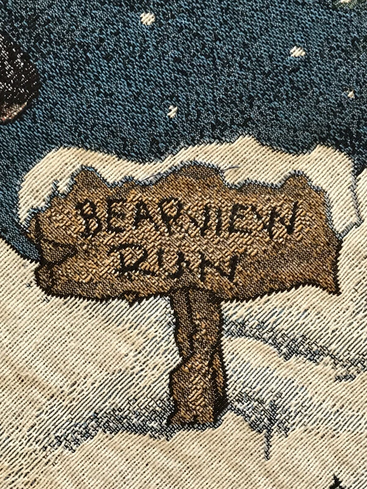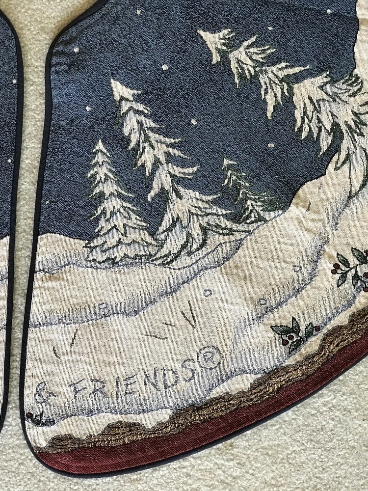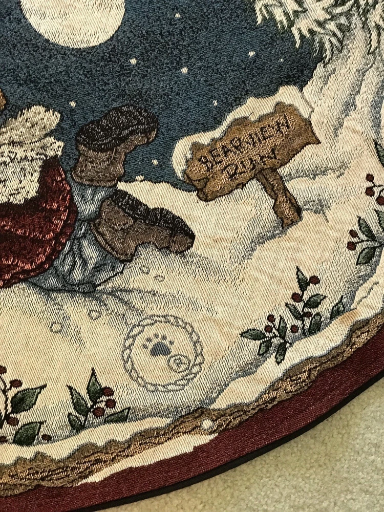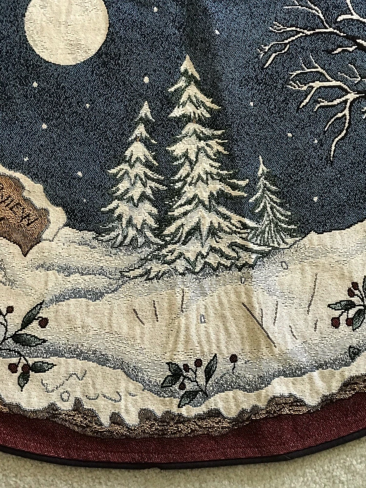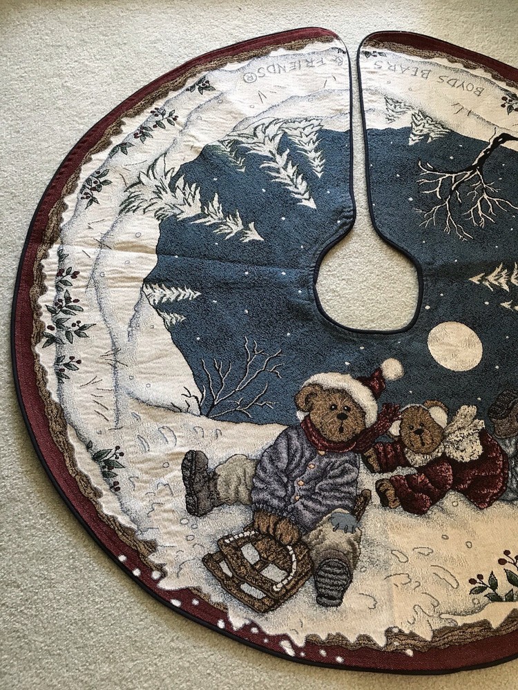 *** Very minimal sown repair on the edge piping. See the last 2 photos for the example. Very slight. Barely noticeable. **** The Boyds Bears Tapestry Christmas Tree Skirt featuring the scene "Enjoy the Ride" with snow sledding, is a large circle-shaped decor made of polyester, cotton, and acrylic materials. This multicolor tree skirt by Boyds Bears is perfect for holiday celebrations, adding a festive touch to your Christmas tree. The tapestry design and holiday theme make it a charming addition to your seasonal décor, while the high-quality materials ensure durability and longevity in your home. In a smoke free home.