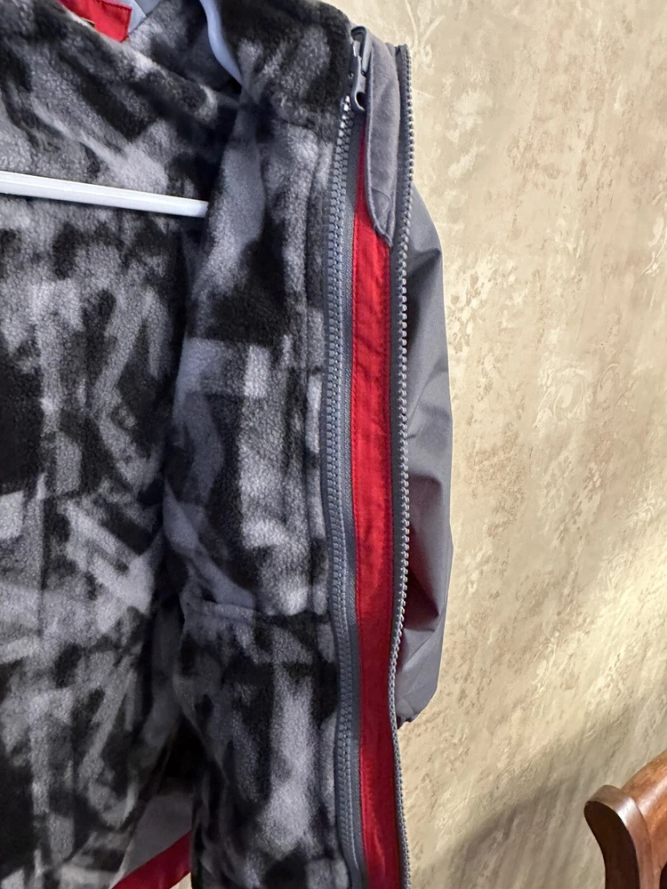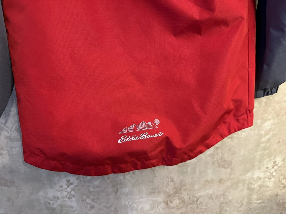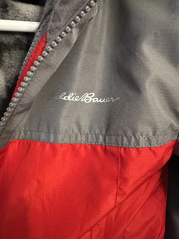 This is a Boys Eddie Bauer Jacket in size 5/6, designed with a zip closure for easy wear. The outer shell material is 100% nylon, providing durability and protection from the elements. This gray and red jacket features a basic style perfect for everyday wear, and it includes a zip liner for added warmth and versatility. Perfect for young boys who enjoy outdoor activities or simply need a reliable jacket for cooler weather. 299