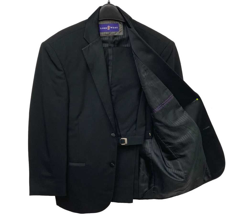 Black Lord West Tuxedo Jacket with Pants Upgrade your formal wardrobe with this high-quality wool tuxedo! Material: Crafted from superior 100% wool for exceptional quality and durability—much better than cheap polyester. Condition: In great shape, ideal for any formal event. Shipping: In stock and ready to ship—no long wait times from overseas! Features: Standard fit will fit true to size Classic satin notch lapel 2-button single-breasted closure Non-vented in back Matching pleated front pants with a satin tuxedo stripe Adjustable waist for a comfortable fit Note: This purchase includes the jacket and pants only!