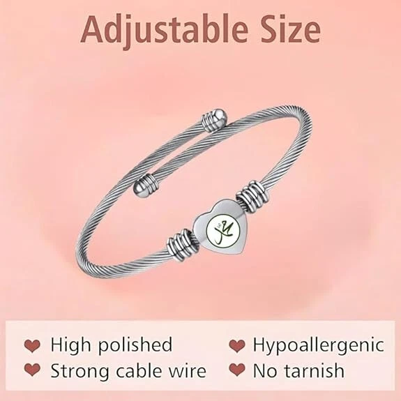 Elegant but cute bangle bracelet with heart charm, fashionable and perfect to bright up your overall outfit. This romantic heart design with adjustable size feature will make it great mother gift and best friend bracelet. Customizable: We can engrave some words on the heart charm for you. Size:The Letter Cuff Initial Bangle Bracelet is Expandable,You can use a soft ruler to measure the circumference of your wrist or ankle so that you can choose the product that suits you. Material: Alphabet Cuff Letter Initial Bangle Bracelet jewelry is made of high quality stainless steel which is 100% safe for sensitive skin ,and it has been electroplated so it will not fade,tarnish,rust or stain. This beautiful Letter Initial Alphabet cuff bangle bracelet can be as a fashion gift for mother or father or grandfather or grandmother or brother or sister or wife or husband or daughter or son and other loved ones.This charming anklet jewelry is suitable for all occasions, all kinds of anniversaries and all people like women,men,boys,girls,adults,elder people or children.For different people,it has different meanings and expresses different feeling. Packaging: We will carefully package the product, you don't have to worry about the jewelry charm being damaged. After-sales service: We sincerely serve you, if you have any other questions, you can contact us at any time, we are happy to serve you.